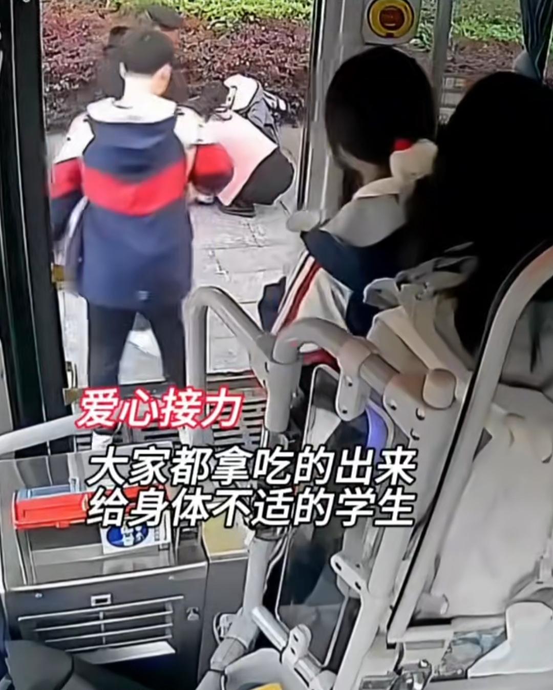 驾驶员将学生搀扶下车,让他坐在路边休息,一边轻声安抚,一边接过乘客递来的食物,耐心地让孩子补充能量。直到看着学生脸色慢慢好转、精神恢复,他才重新回到驾驶位,继续发车运营。