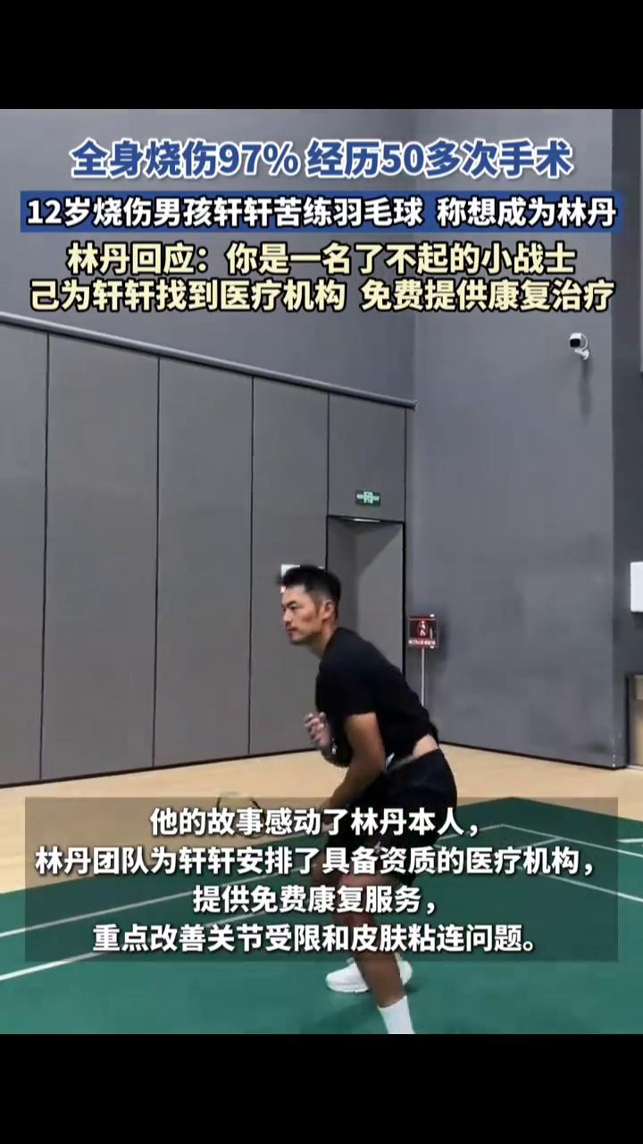 12岁烧伤男孩轩轩因家中火灾导致全身烧伤97%,已接受50多次手术,但仍坚持苦练羽毛球,并立志在5年内成为像林丹一样的羽毛球运动员。他的故事感动了林丹本人,林丹团队为轩轩安排了具备资质的医疗机构,提供免费康复服务,重点改善关节受限和皮肤粘连问题。