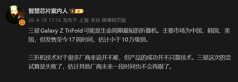 曝三星三折叠屏手机面临退市三折叠市场直接上演冰火两重天!华为Mate XT出货量从50万部上调到100万部,热度一路走高。三星Galaxy Z TriFold就没这么幸运了,开售17周销量还不到10万台,成绩远不及预期,很可能成为三星最短命的折叠屏手机。三星这次折戟,也让不少手机厂商对三折叠赛道变得谨慎。大家怎么看三折叠?