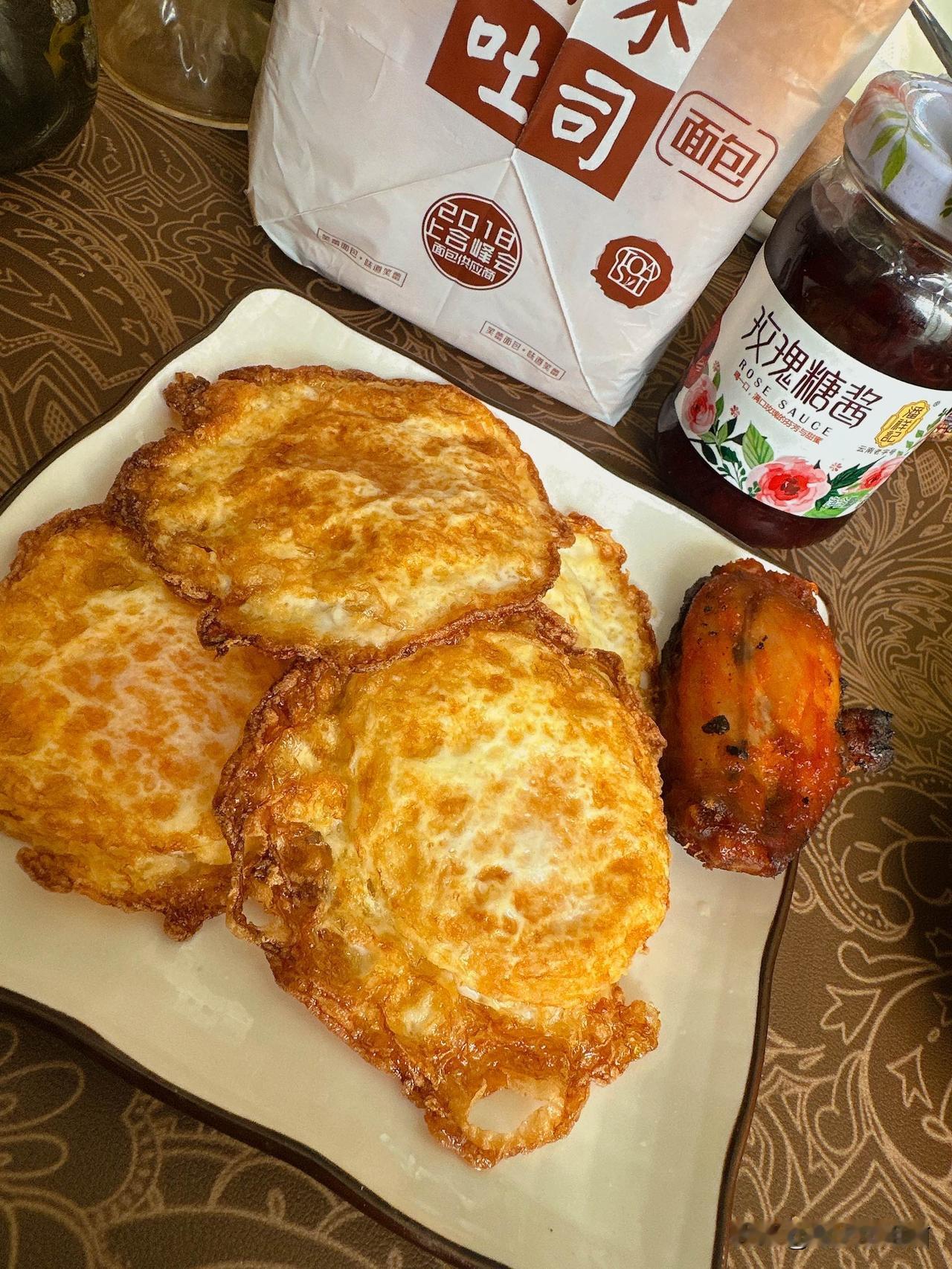 包完了海参吃了一顿最简单的早餐 烫了一只海参, 煎了四个乌鸡蛋, 拿出来一包面包