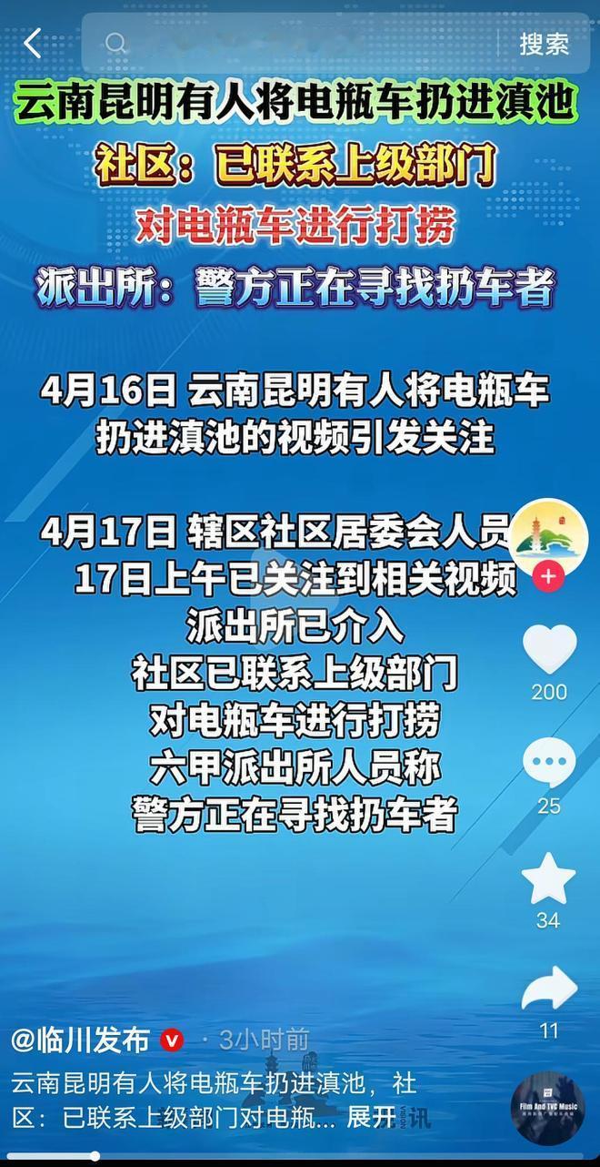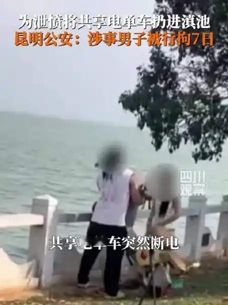 怒扔共享电车进滇池逞一时之快,最终自食恶果付出代价