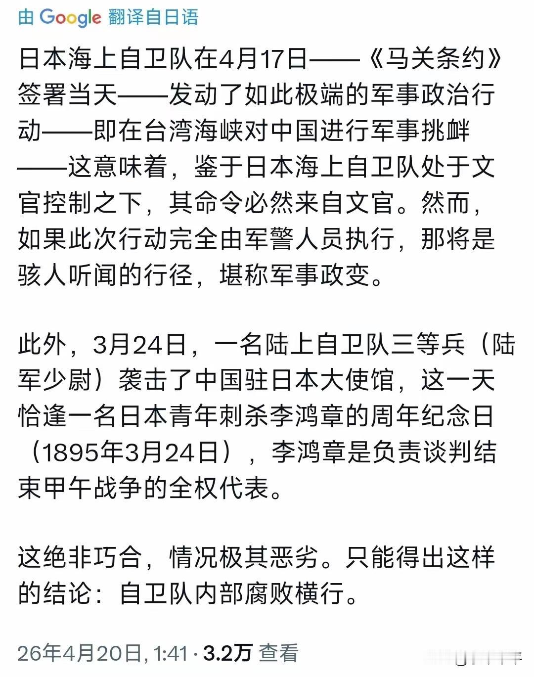 4月20号,牧田宏发文称:“日海自卫队竟在《马关条约》签订纪念日……进行军事挑衅,……是一场军事政变,是不可饶恕的暴行!”