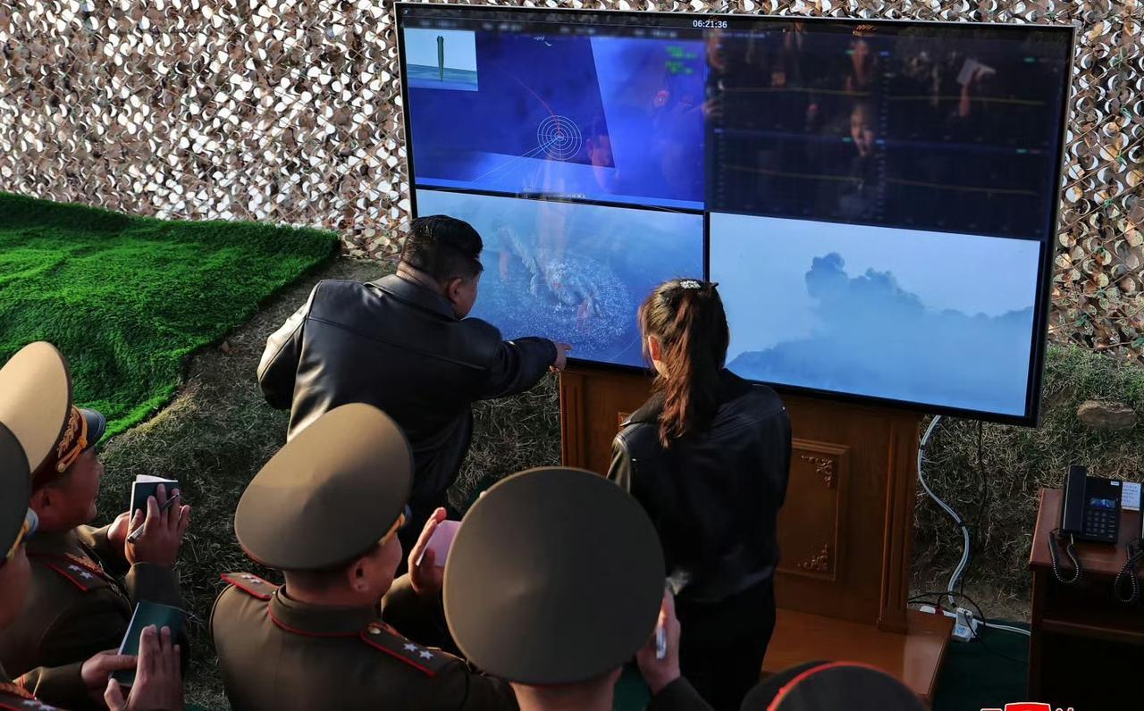 据朝中社官方报道,这次导弹试射全程由朝鲜最高领导人亲自现场监督,朝中社还公布了现场画面,司令和女儿一同身着黑色皮夹克,在海岸观测点全程紧盯导弹发射,一枚导弹拖着浓烟划破海面,试射现场画面十分清晰。