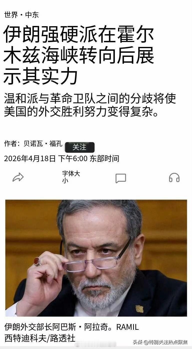 伊朗外长阿拉格齐因宣布开放霍尔木兹海峡遭国内强硬派及官方媒体批评,此举与军方后续重新管控该海峡的决定相矛盾,凸显其外交表态受制于国内军事和政治压力。