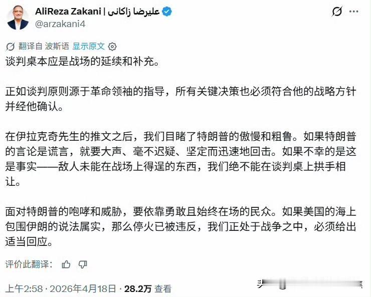 4月17日,阿拉格齐宣布霍尔木兹海峡根据“黎巴嫩停火协议”向商船开放,但此声明迅速被伊朗军方推翻——不到24小时后,军方宣布重新实施管控。