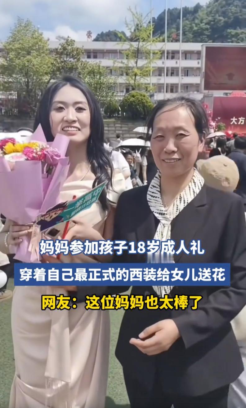 贵州,一高中举办孩子们18岁成人礼,一位女孩的母亲并没有浓妆艳抹,反倒是穿上了自己最正式的西装给女儿送花,网友:这张的也太像了,我以为是两个妈妈站一起拍照!