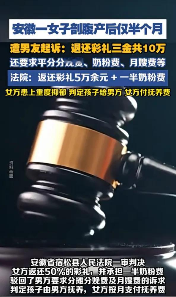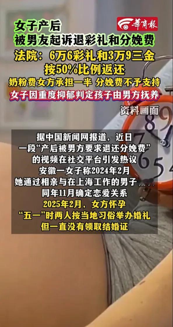 男方把她告上了法院,要求她退还全部彩礼和三金,还要平摊住院分娩、请月嫂、买奶粉的所有费用。