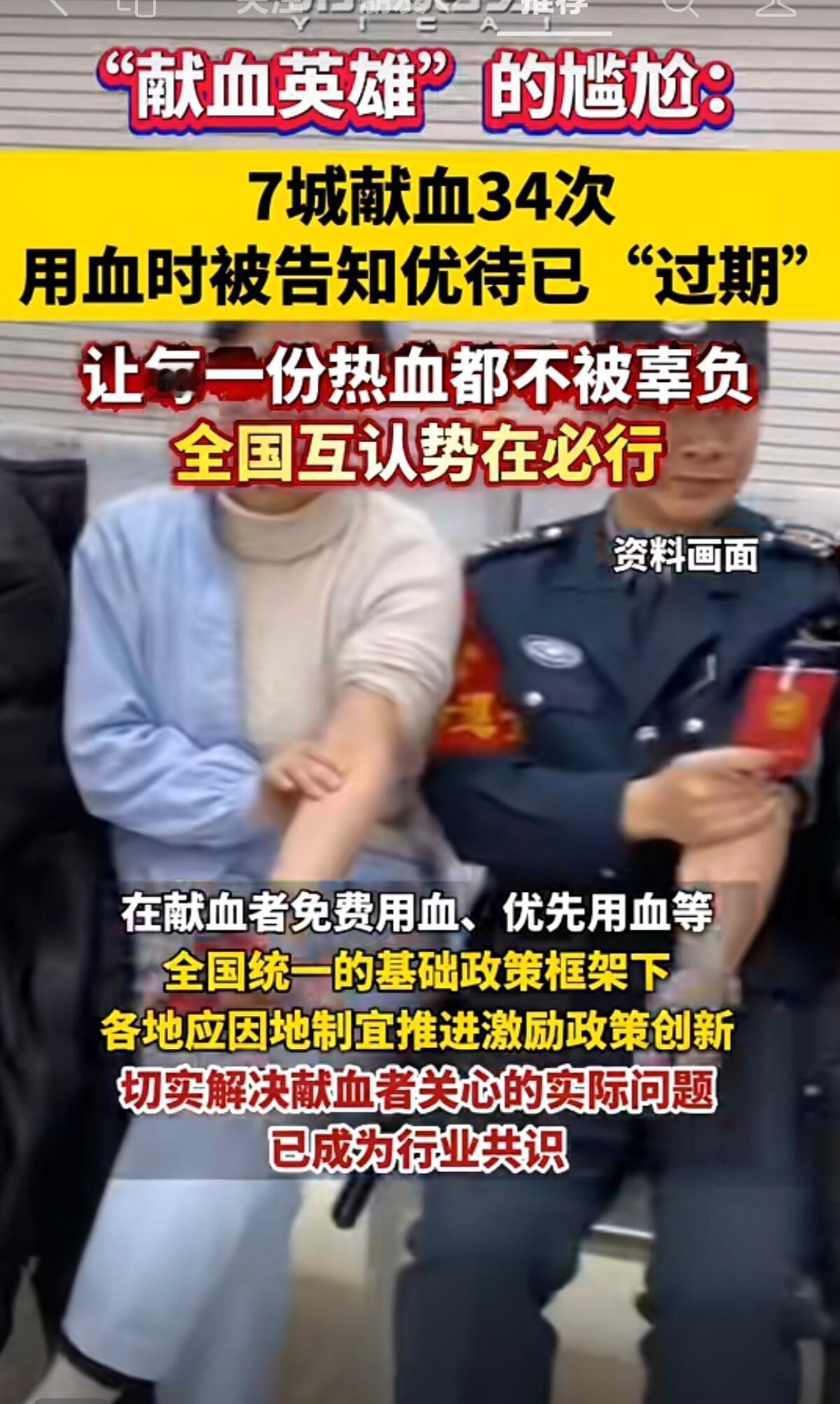 按规定,无偿献血的优待应该是终身的,家属也能用。但到了底下,各地政策经常打架,年限算得不一样,异地信息也不通,搞得很多像她这样的热心人寒心。