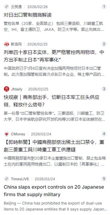 第二批是“出口管制关注名单”,又是20家,斯巴鲁、住友重工、TDK、东京科学大学等名列其中。这批企业大多是民用领域的龙头,但都存在两用物项流向军事用途的风险。列入关注名单意味着:出口商向这些实体出口,不能走快速通道,必须单项申请,还得提交风险评估报告和不用于军事用途的书面承诺,审查期限没有上限,涉军用途一律不批。这相当于给日本高端制造业的所有关键环节都戴上了紧箍咒。消息一出,东京股市防卫和重型机械板块立马跳水,三菱重工股价当天跌了3.1%,IHI暴跌5.73%,川崎重工跌了4.02%。资本市场用脚投票,效果立竿见影。