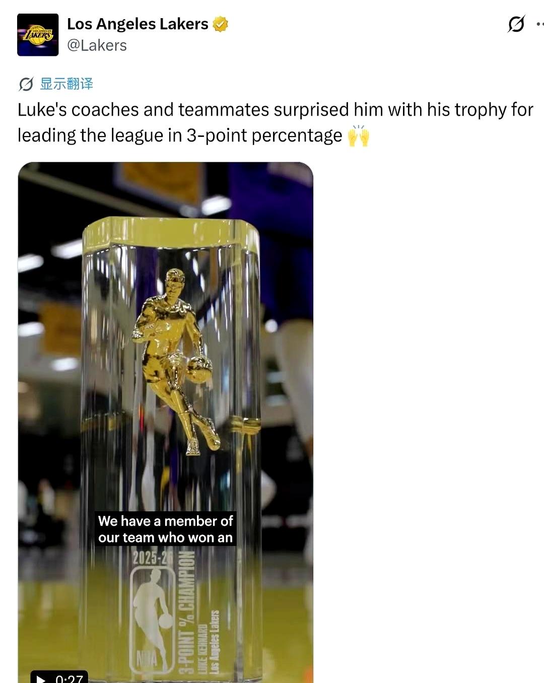 季中从老鹰过来后,他这外线火力直接把球队盘活了,还跟八村塁一起捅破了队史单赛季三分纪录。湖人官方放出这段视频,满屏都是人情味。把个人荣誉变成团队惊喜,这凝聚力杠杠的。