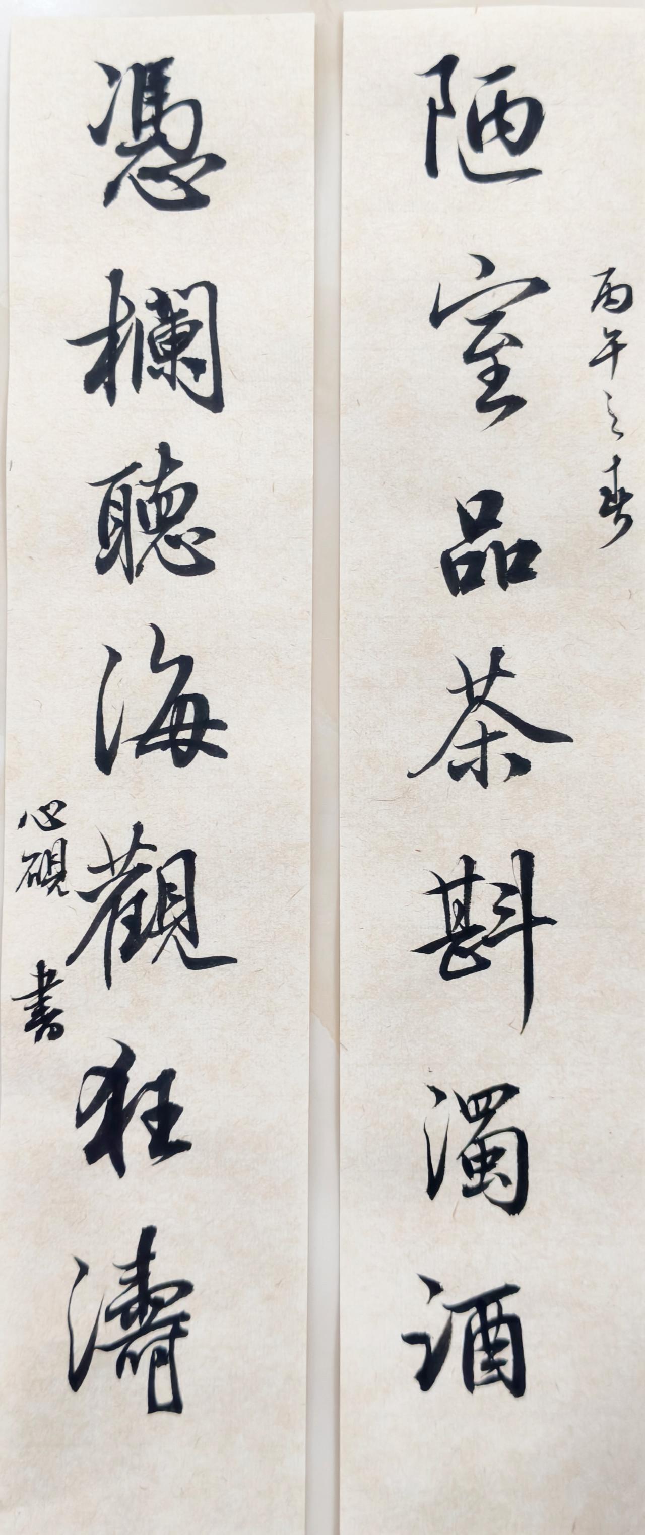 看着这副对联,我认真品味其中的含义。陋室品茶,慢斟浊酒,是烟火里的闲适;凭栏听海,静观狂涛,是喧嚣外的疏朗。一静一动间,藏着不随俗流的心境,于方寸天地,寻得自在安然。展示下您的书法作品 清雅闲适对联