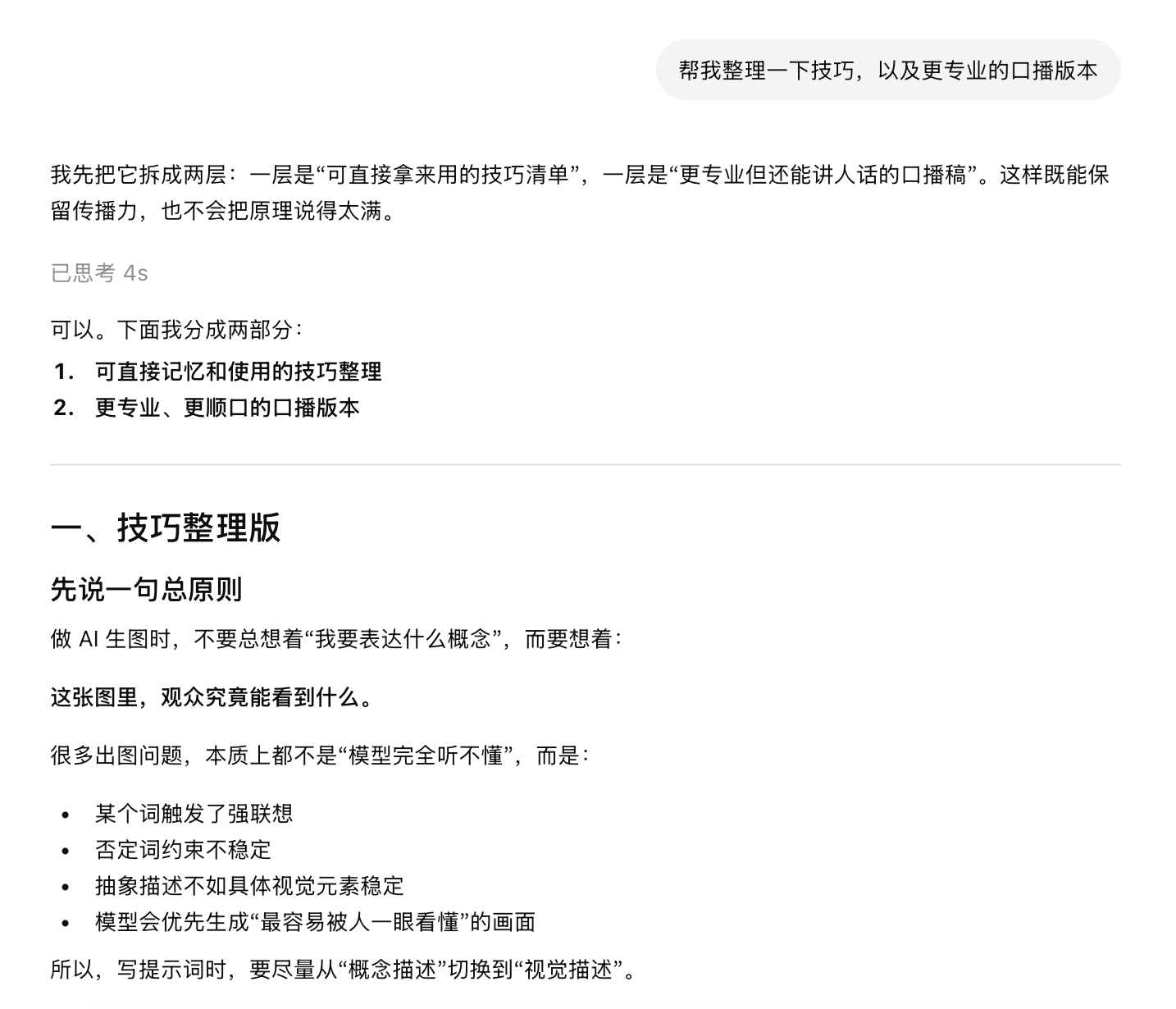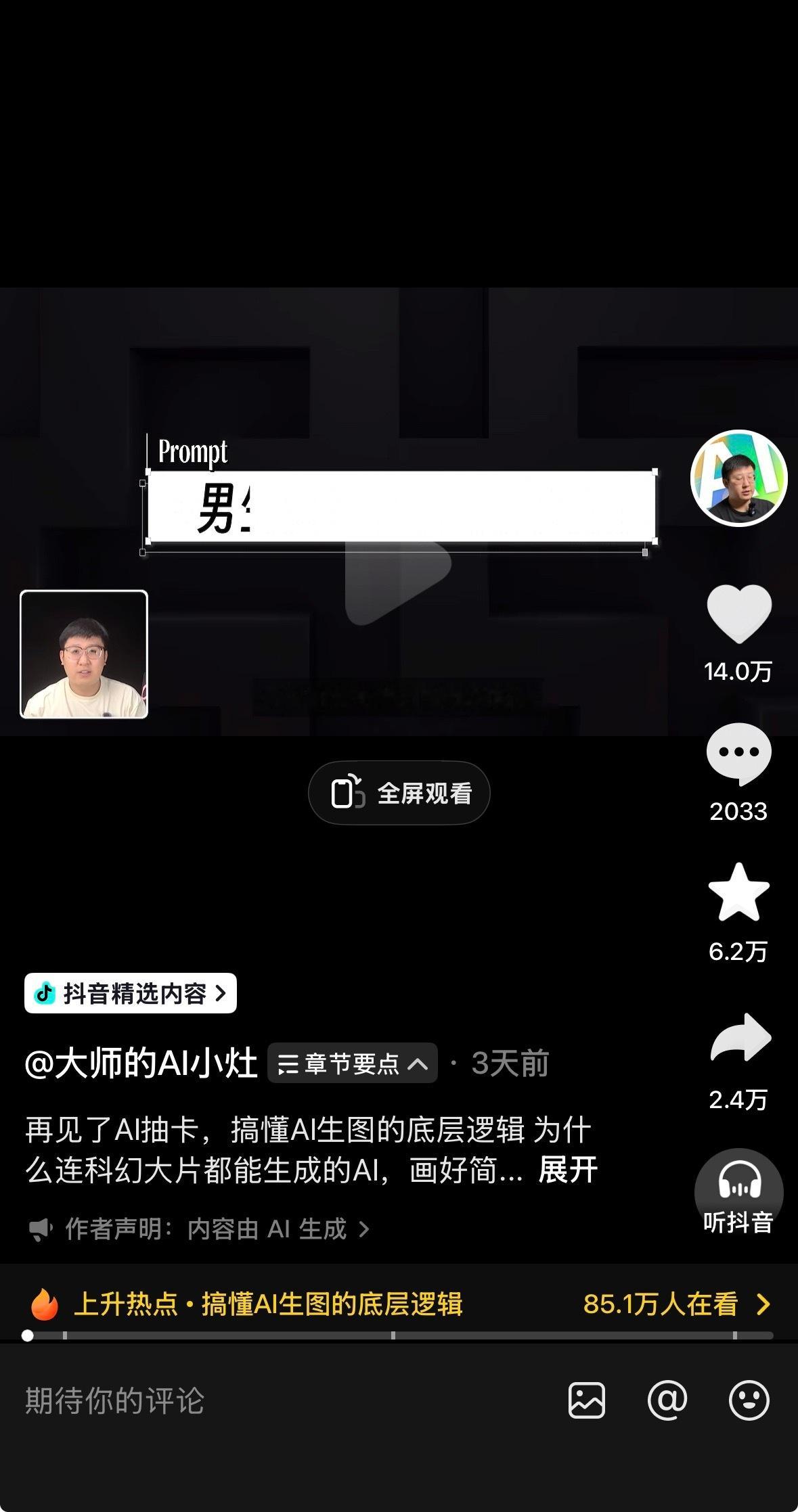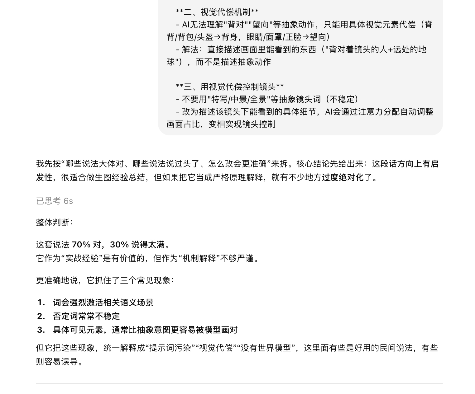 DY 刷到了这个讲 AI 生图的视频,它讲的是如果你老是给模型一些抽象的概念、位置关系,模型的表现不够稳定,你其实可以换个方法,直接描述你想要场景的画面信息。例如特写,不要说特写,直接把面部信息描述清楚,效果更好、稳定。