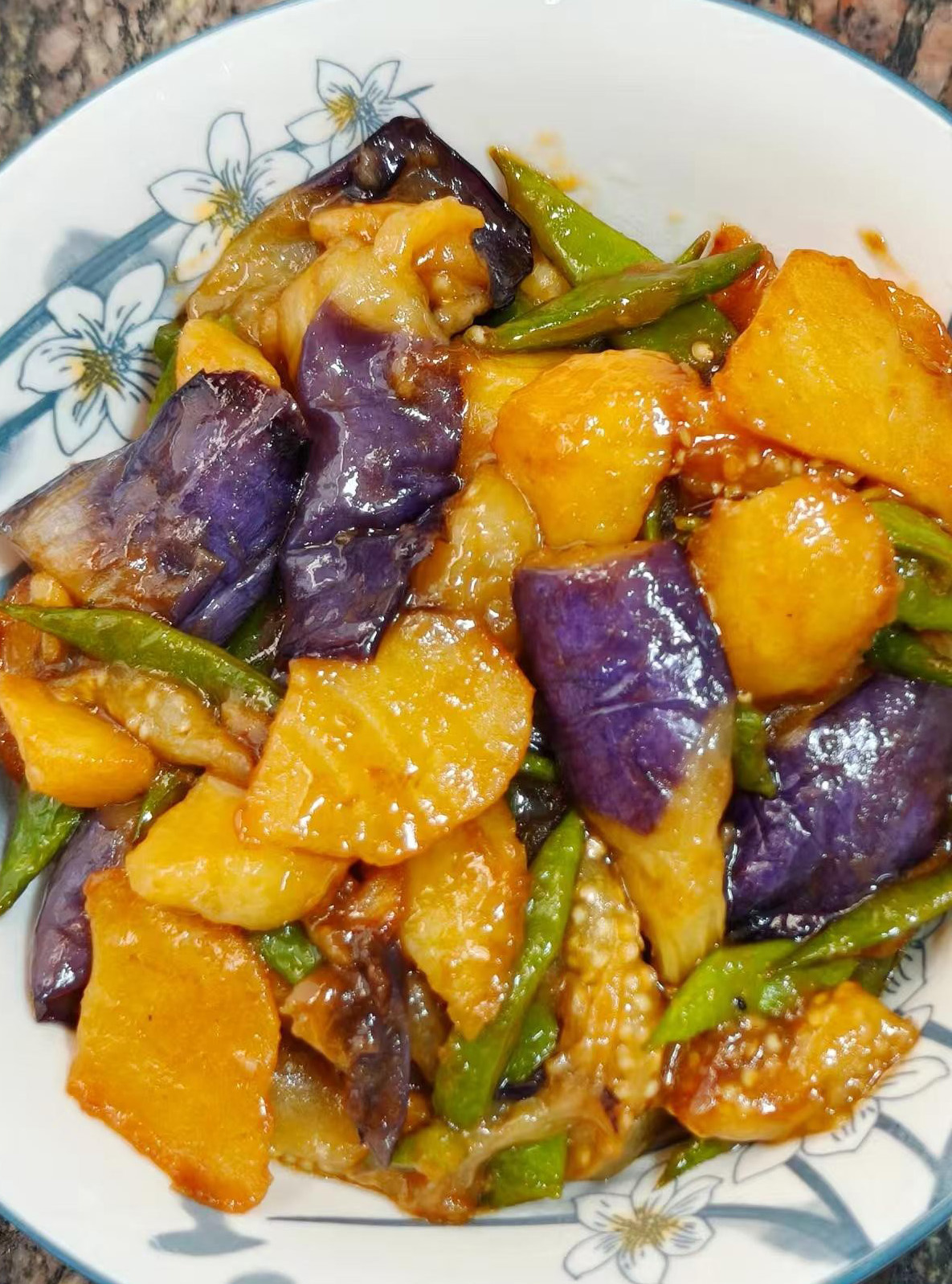 3️⃣ 风味地三鲜经典的下饭菜!茄子、土豆、豆角过油后,和调好的酱汁一炒,软嫩入味,咸香下饭。春天没胃口的时候,来一盘超合适,食材都是菜市场随手能买到的,做起来也不费劲~