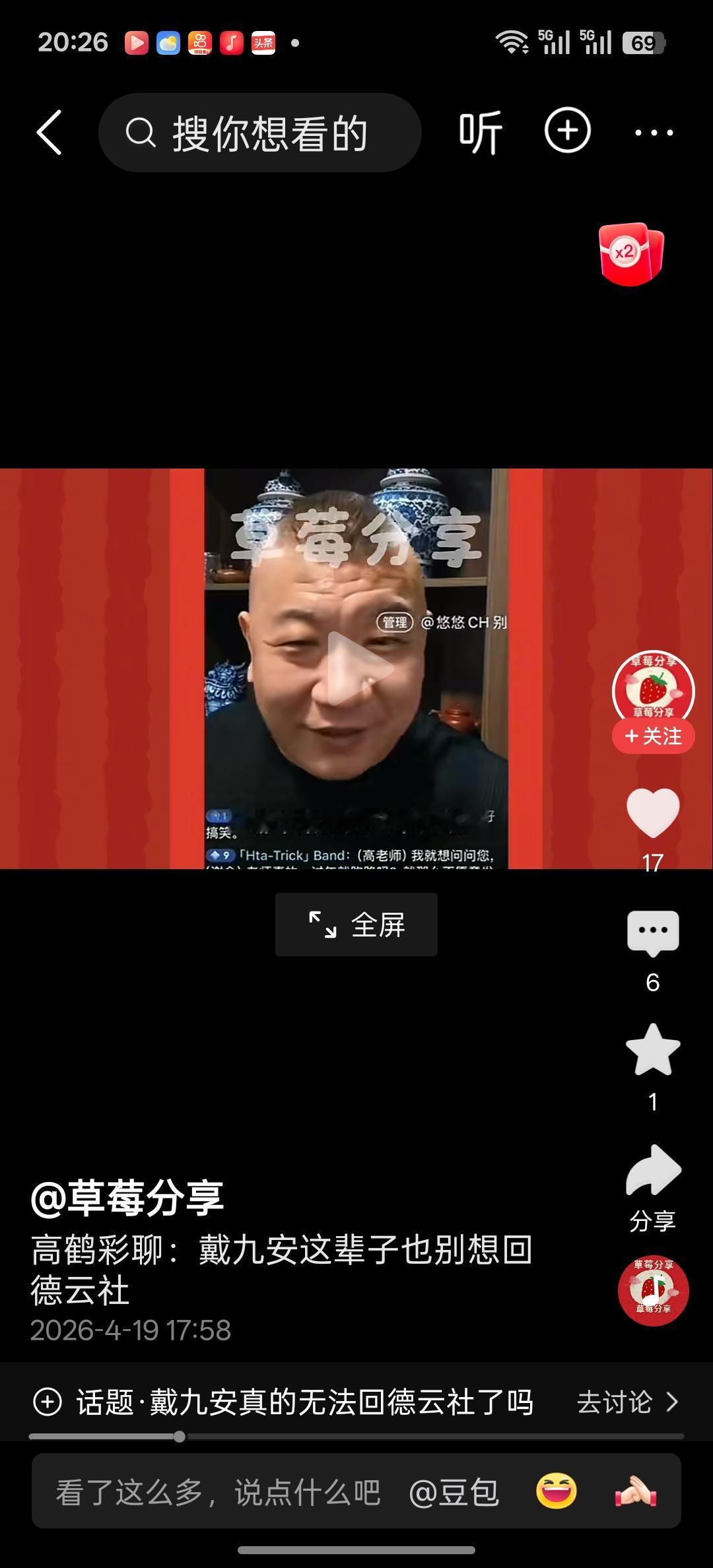 这两天大泥粉丝贬损戴九安出现了一个小高潮,许多带有“云鹤九霄”字网名的发的视频和微头条齐飞,在这些贬损戴九安的人群中有一个人的出现是非常不合时宜的,这个人就是高鹤彩,因为所有骂戴九安的人是大泥铁粉,是为了自己崇拜的人而出手,这种激进行为尚可理解,但是高鹤彩加入大泥战队就非常欠妥,因为,第一高鹤彩是有社会职务的,上海曲协理事、而且曾经作为上海曲协代表参加国家曲协会议并和姜昆合影,作为上海曲艺行业的领头团队人员参与网暴他人合适吗?特别是在中央网信办打击网暴的大环境下,第二戴九安和高鹤彩不论之前还是现在没有利益之争,第三作为离开德云社多年的演员,指责戴九安出师无名,首先说戴九安的九字是假九,请问戴九安在德云社多年没有叫戴九安这个名字吗?即便不允许戴九安用这个九字,是不是应该由郭德纲说,其次说戴九安回德云社门也没有,咋啦?戴九安能否回德云社的决定权是您吗?再有戴九安直播时祝福师母王慧生日快乐,你说戴九安:用得着你祝福吗?咋啦?谁祝福王慧生日快乐还需要您批准吗?既然没有拍板的权利说这些大话有用吗?第四现在戴九安和郑好的隔空博弈胜负已经非常明了,高鹤彩站队郑好贬损戴九安实属没有审时度势,顽皮和三强、李老师这几位陆续声援支持戴九安说明什么问题?他们三个人发声只代表自己吗?可见高鹤彩此举于公于私都有弊无利。