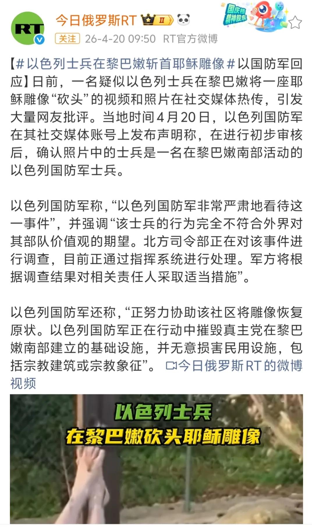 以色列军方承认以军士兵在黎巴嫩南部将一座耶稣像“斩首”破坏,并表示将对责任人进行“适当”处理,可以断定处理必然是不痛不痒。