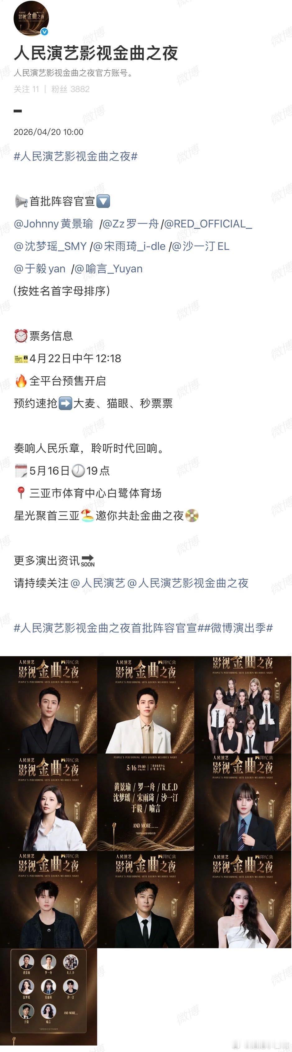 人民演艺影视金曲之夜首批阵容官宣人民演艺影视金曲之夜 有没有人和我一样盯着阵容名单看了三分钟?之前就听说这个活动是春晚级别的制作,现在居然把这么多不同领域的艺人凑到一起,于毅老师的戏腔、喻言的大vocal、宋雨琦的舞台表现力,光想想同台的画面我都激动,这次肯定能听到好多久违的影视OST吧!