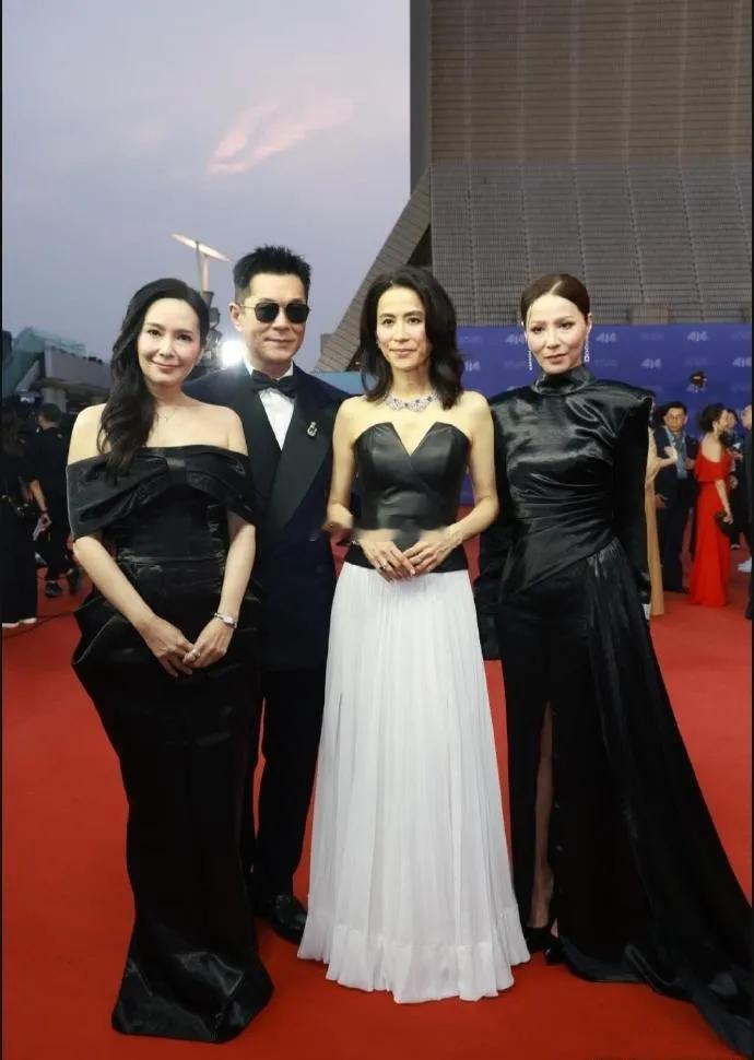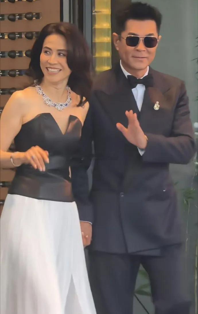 古天乐和宣萱手牵着手一起现身颁奖典礼,古天乐里面穿了一件白色衬衣,外面套着黑色的西装,脖子上系着黑色的蝴蝶结。整个人看上去很有绅士范儿。宣萱上身穿黑色的抹胸皮衣,大秀美肩,脖子上搭配了奢华的项链,尽显高贵风情。