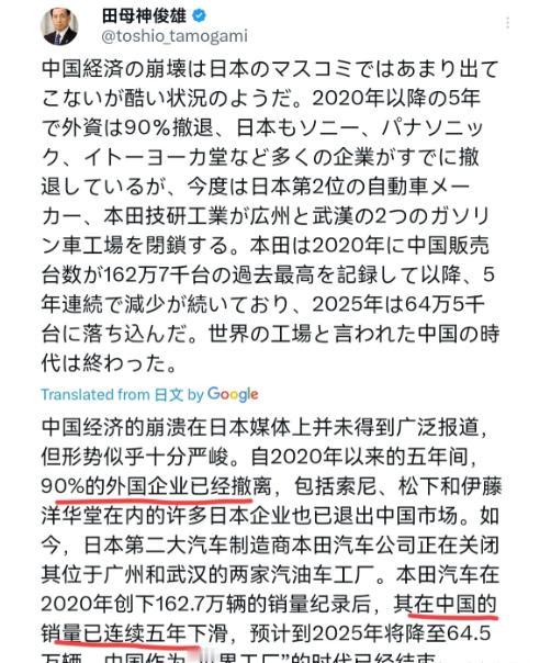 日本前航空幕僚长田母神俊雄声称,中国时代已然终结!4月19日,田母神俊雄表示,虽然日本媒体很少报道“中国经济崩溃”,但情况似乎十分严峻。2020年之后的五年间外资“已撤离”90%,日本方面索尼、松下、伊藤洋华堂等众多企业也已“撤出”。此番日本第二大车企本田技研工业,将关闭位于广州和武汉的两家燃油车工厂。