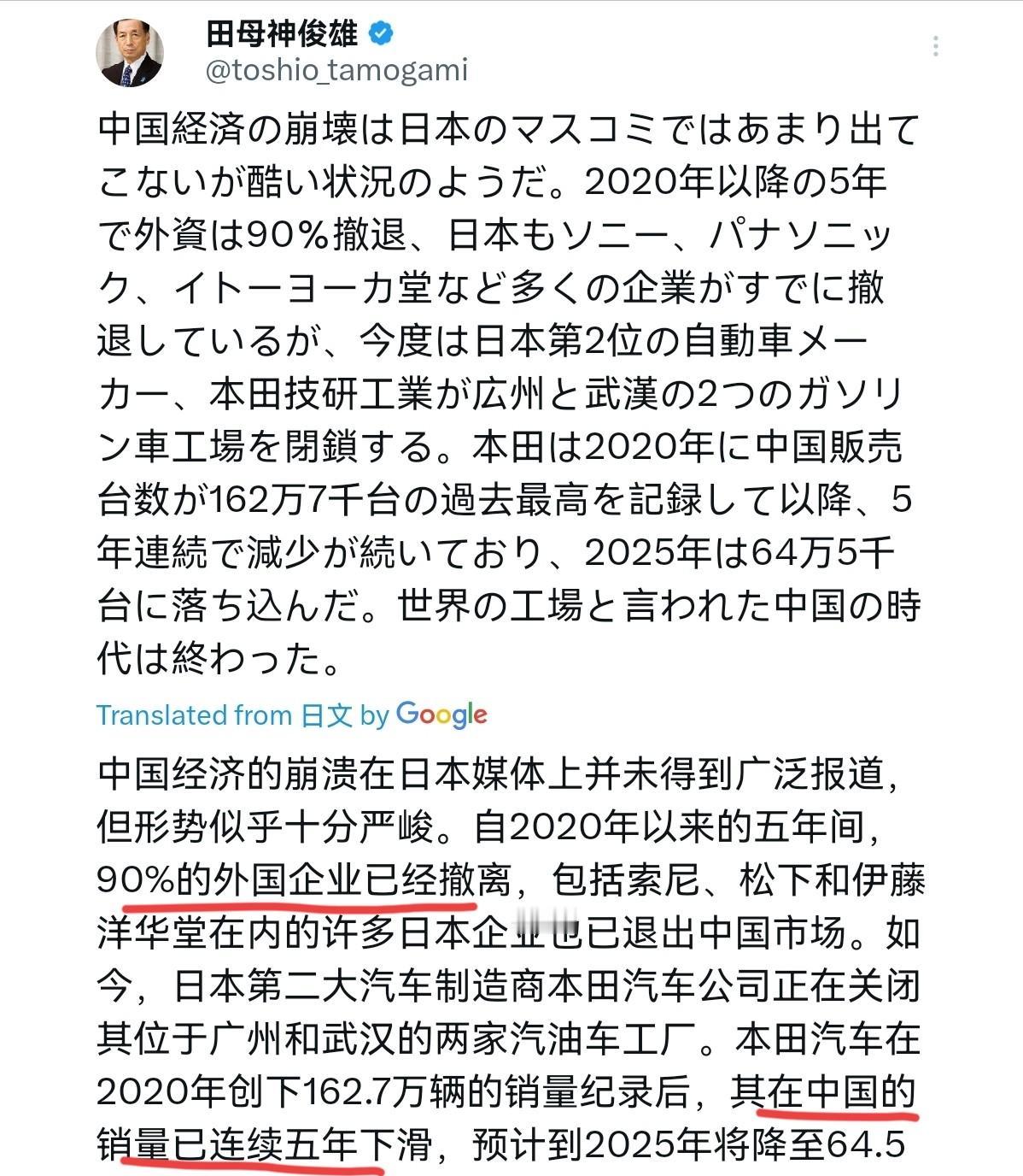 他刻意炒作中国经济形势严峻,编造外资大规模撤离、大批日企出逃的谎言,还借本田关停国内两家燃油车工厂大肆渲染负面论调,却怎么也掩盖不了日本的惊慌失措。