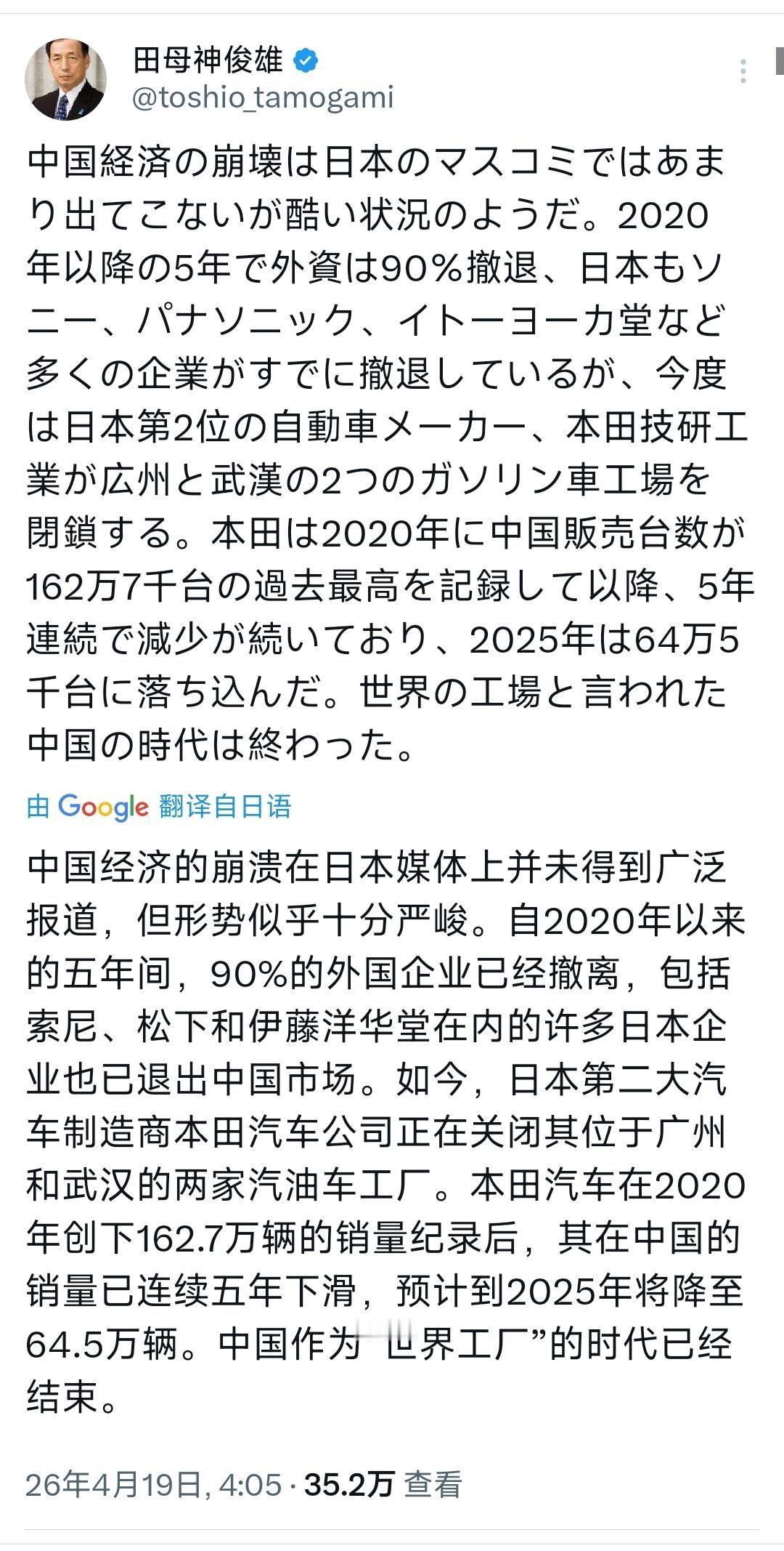 日本极右翼政客、前日本航空自卫队幕僚长田母神俊雄今天(4月19日)抹黑污蔑道:“中国经济的崩溃在日本媒体上并未得到广泛报道,但形势似乎十分严峻。自2020年以来的五年间,90%的外国企业已经撤离,包括索尼,松下和伊藤洋华堂在内的许多日本企业也已退出中国市场。如今,日本第二大汽车制造商本田汽车公司正在关闭其位于广州和武汉的两家汽油车工厂。本田汽车在2020年创下162.7万辆的销量纪录后,其在中国的销量已连续五年下滑,预计到2025年将降至64.5万辆。中国作为‘世界工厂’的时代已经结束。”