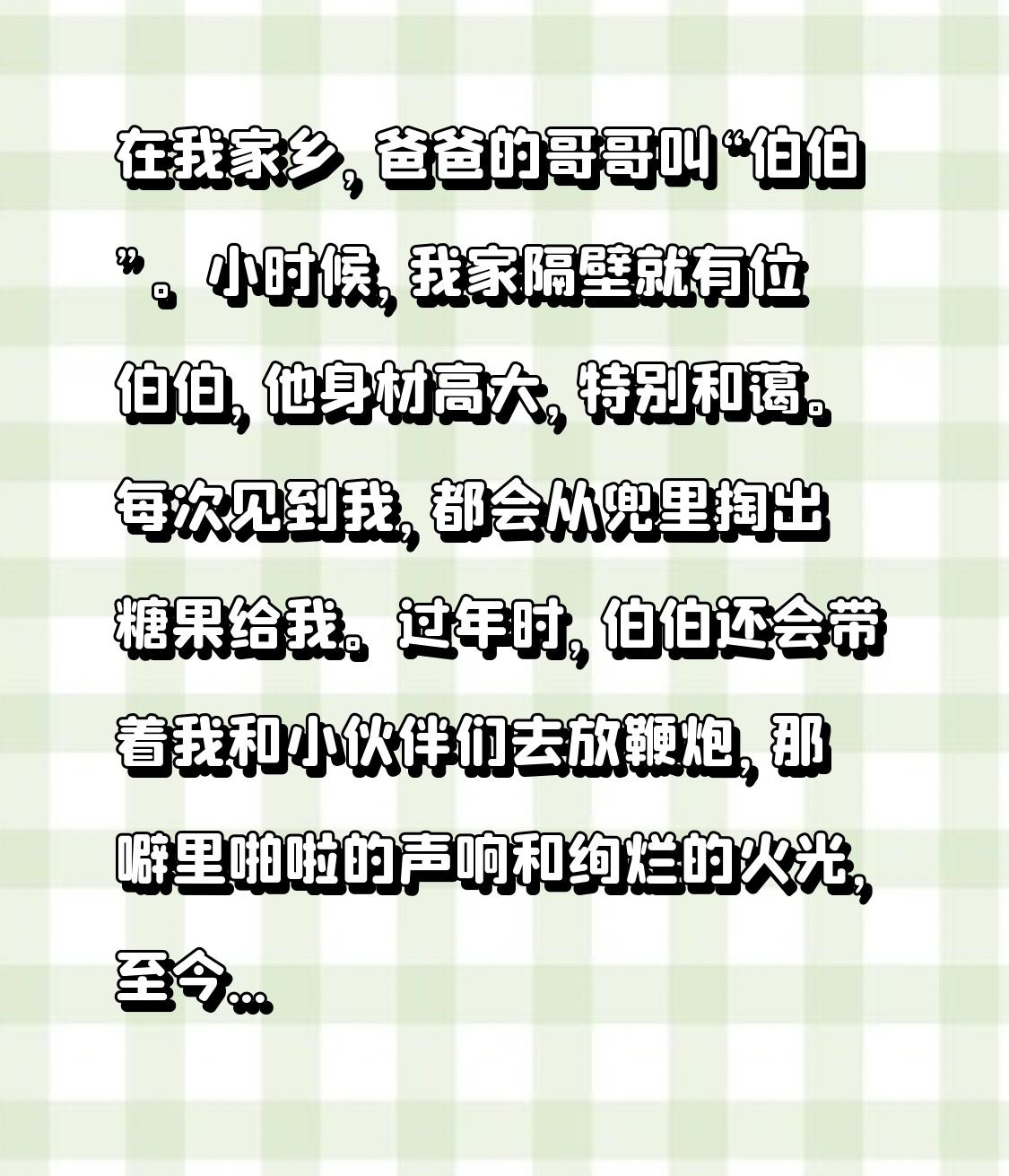 在我家乡,爸爸的哥哥叫“伯伯”。小时候,我家隔壁就有位伯伯,他身材高大,特别和蔼。每次见到我,都会从兜里掏出糖果给我。过年时,伯伯还会带着我和小伙伴们去放鞭炮,那噼里啪啦的声响和绚烂的火光,至今都刻在我的记忆里。伯伯干活也很勤快,家里的庄稼总是种得特别好。农忙时,他还会来帮我家的忙。在我心里,伯伯就像一棵大树,为我们遮风挡雨,给我带来无尽的温暖和安全感。