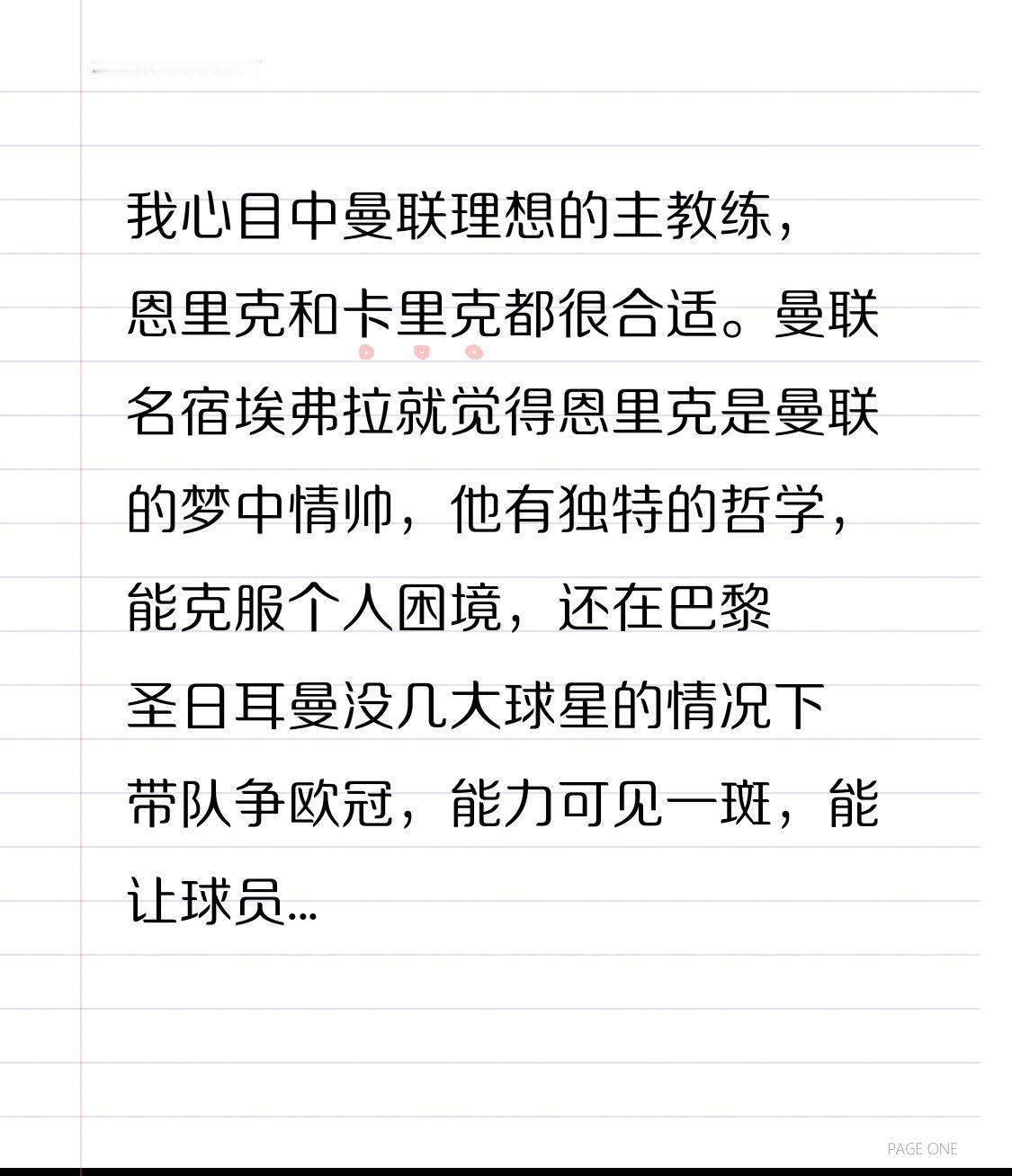 我心目中曼联理想的主教练,恩里克和卡里克都很合适。曼联名宿埃弗拉就觉得恩里克是曼联的梦中情帅,他有独特的哲学,能克服个人困境,还在巴黎圣日耳曼没几大球星的情况下带队争欧冠,能力可见一斑,能让球员为曼联全力奔跑。