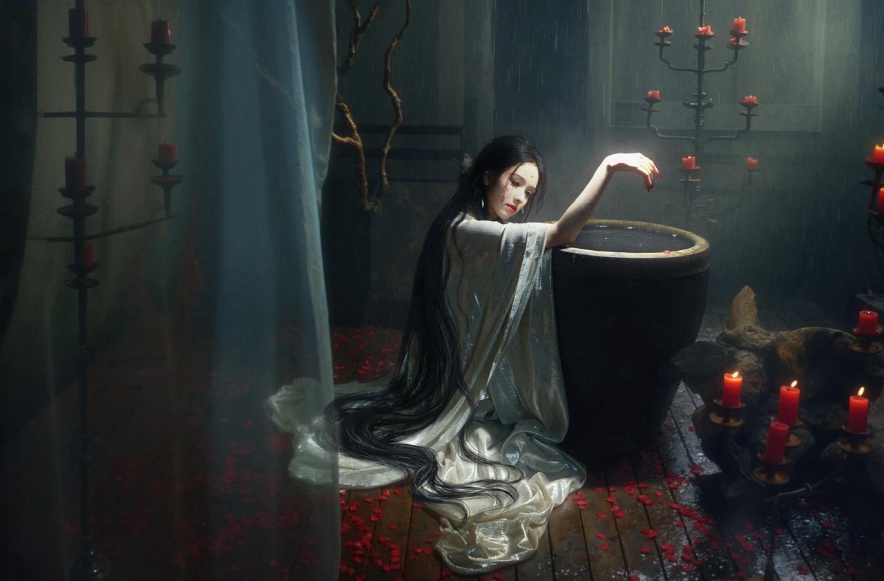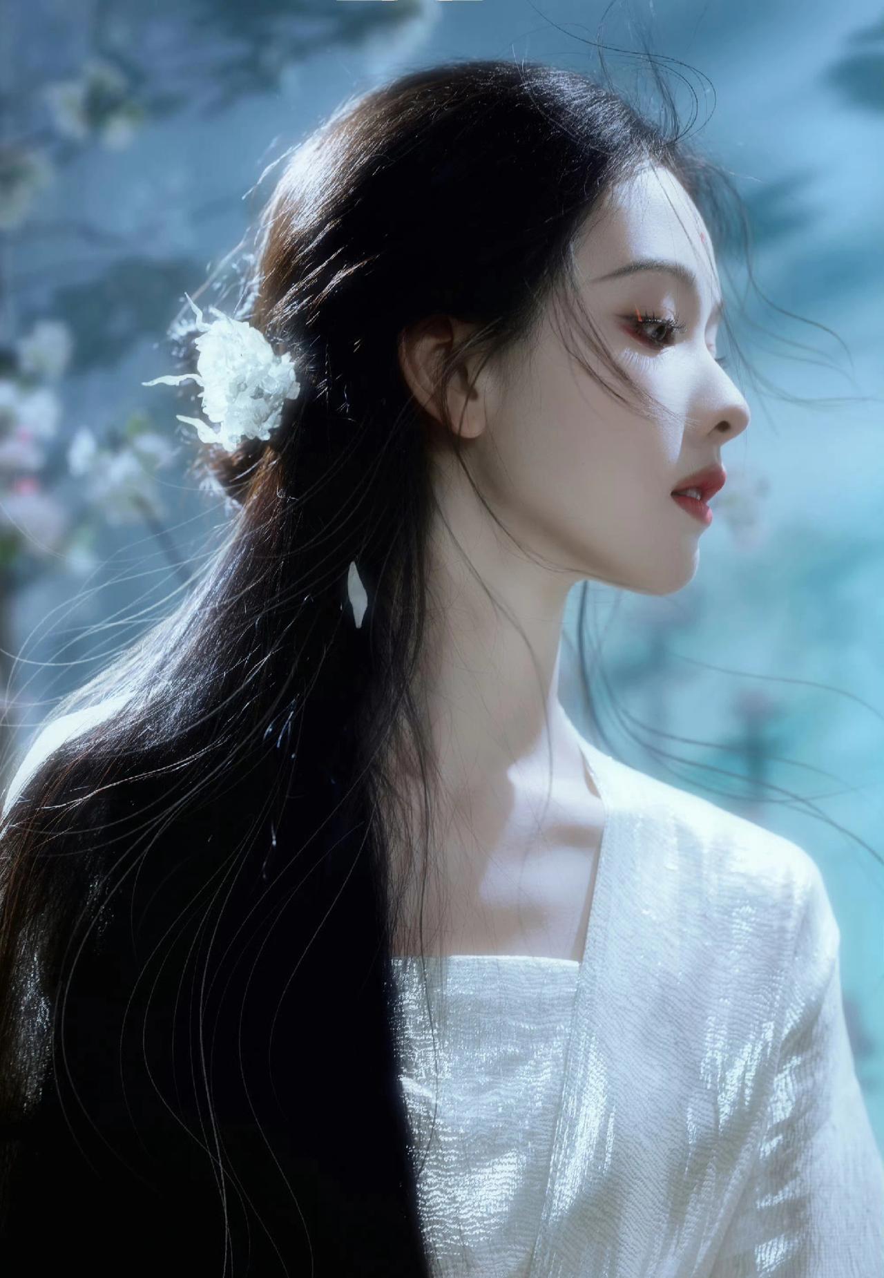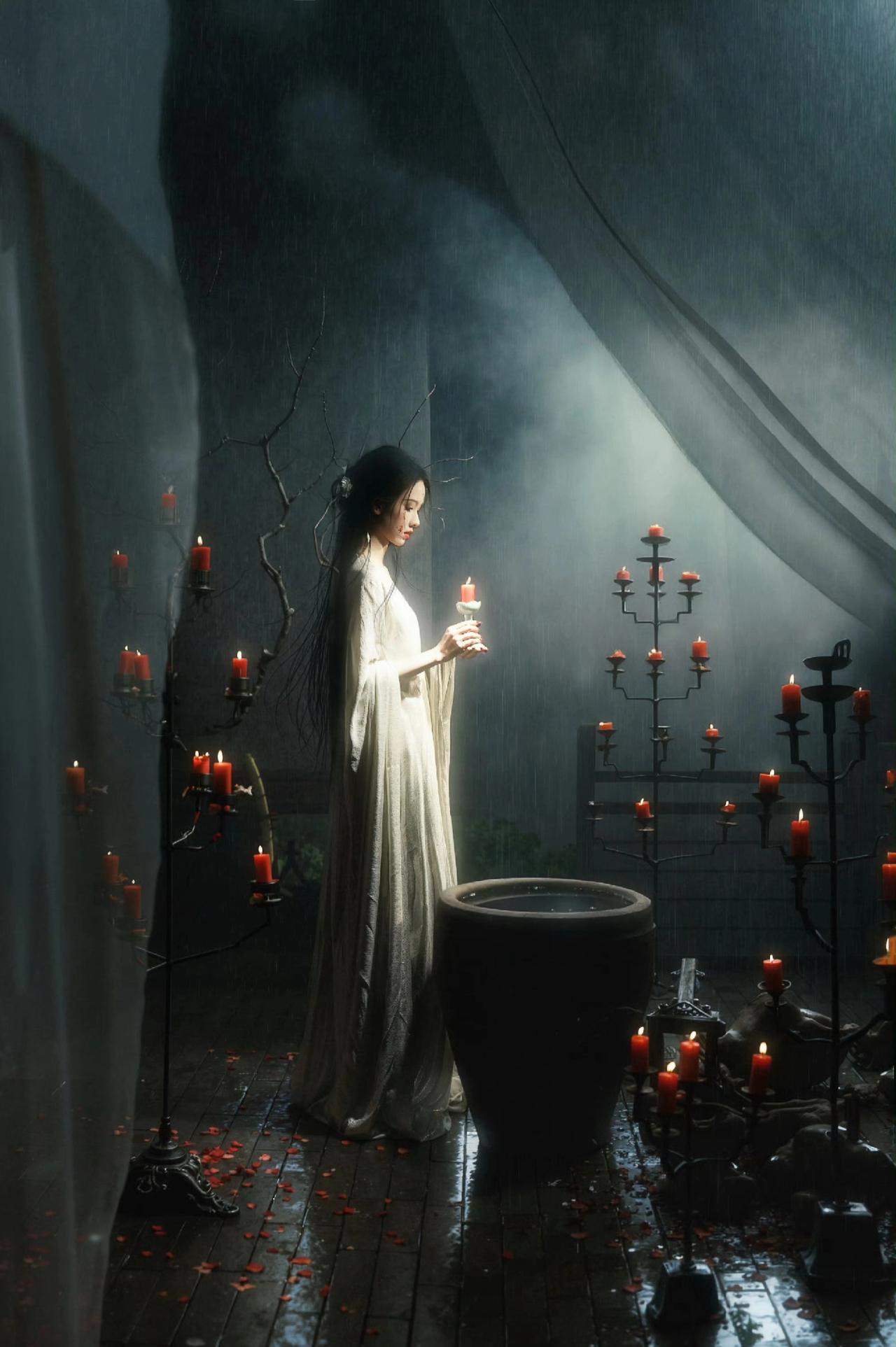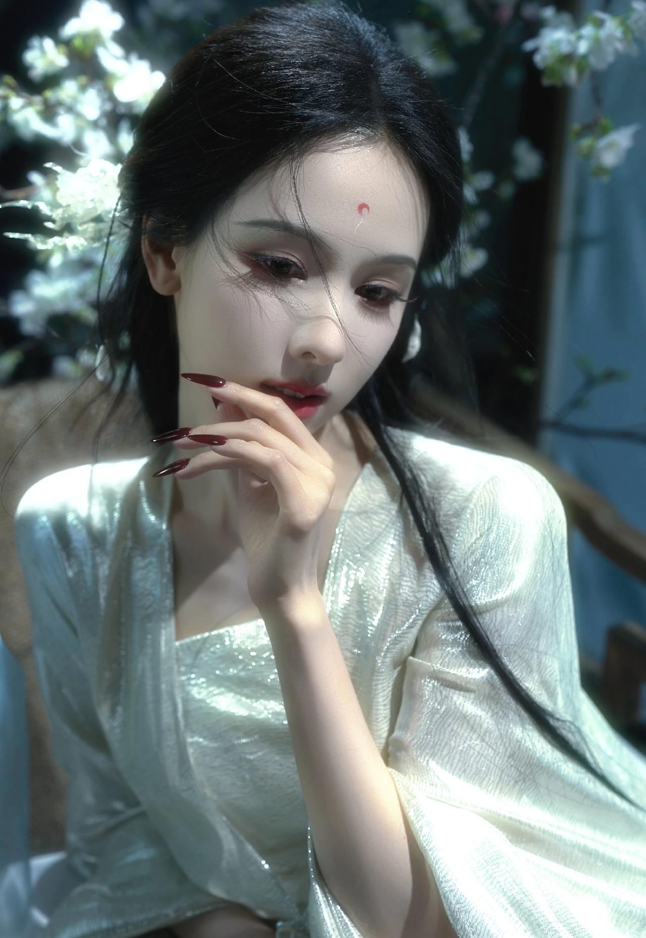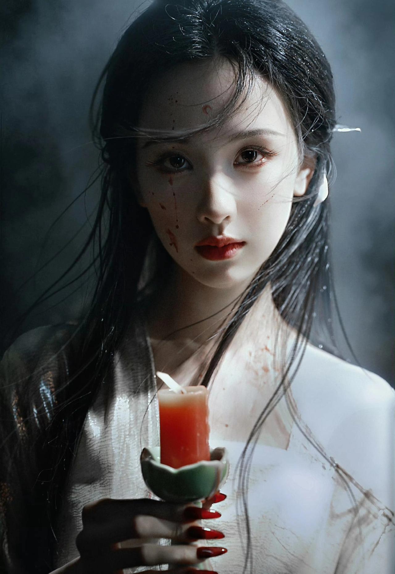 夏弃疾的镜头里,她穿着泛着微光的白裙,在烛火与落花间,额间一点朱砂,眼尾带着红痕,湿发垂落,像从旧梦故事里走出来的人。