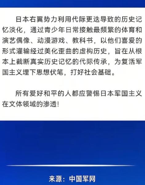 中国军号发声:警惕日本军国主义在文体领域的渗透。国家终于挑明了,那些揣着明白装糊涂,屁股坐歪的人,内心该发怵了。