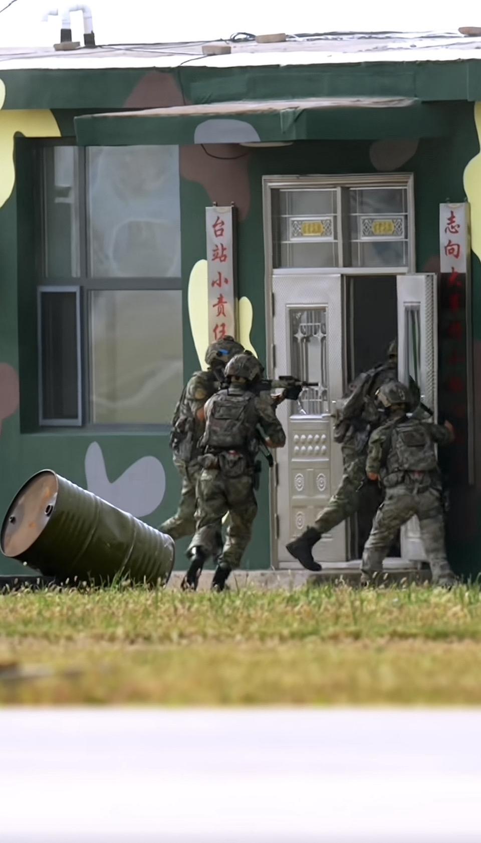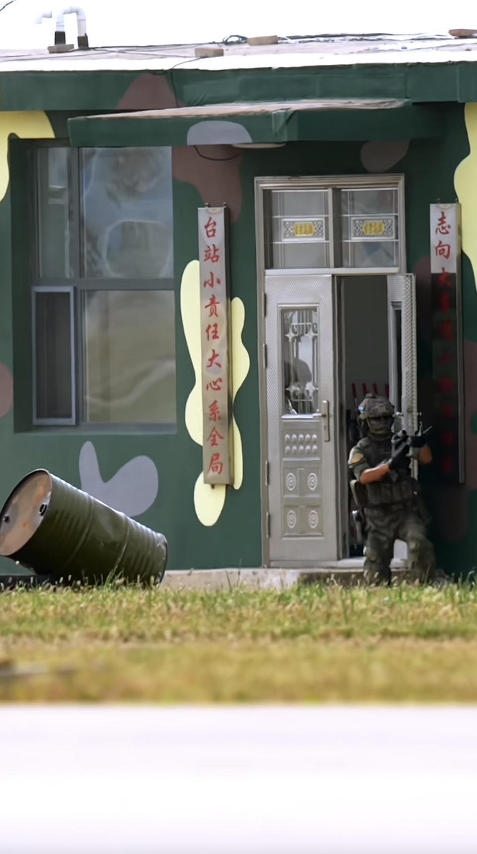 几名身着迷彩作战服、配备专业装备的空降兵战士,呈战术队形迅速逼近一栋迷彩建筑。他们配合默契,有的负责警戒,有的准备突入,动作干练利落。随着战术指令下达,战士们果断冲入建筑内,展现出极强的协同作战能力。片刻后,一名战士从建筑内快速撤出,整套动作一气呵成,尽显空降兵在反恐作战中的专业素养与过硬本领。