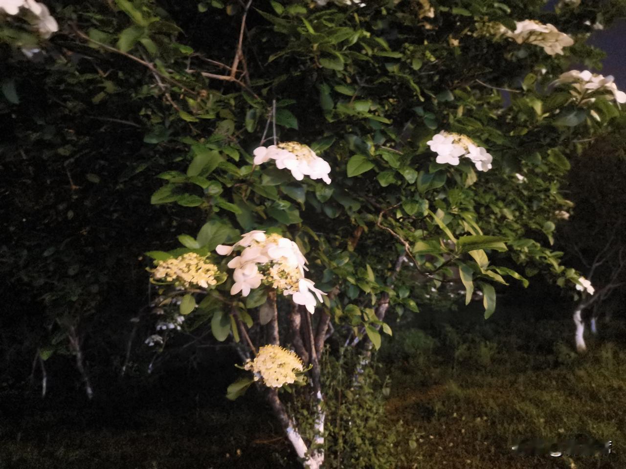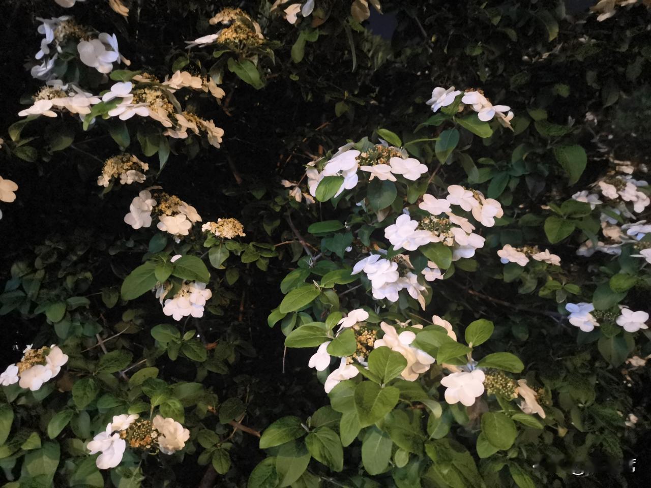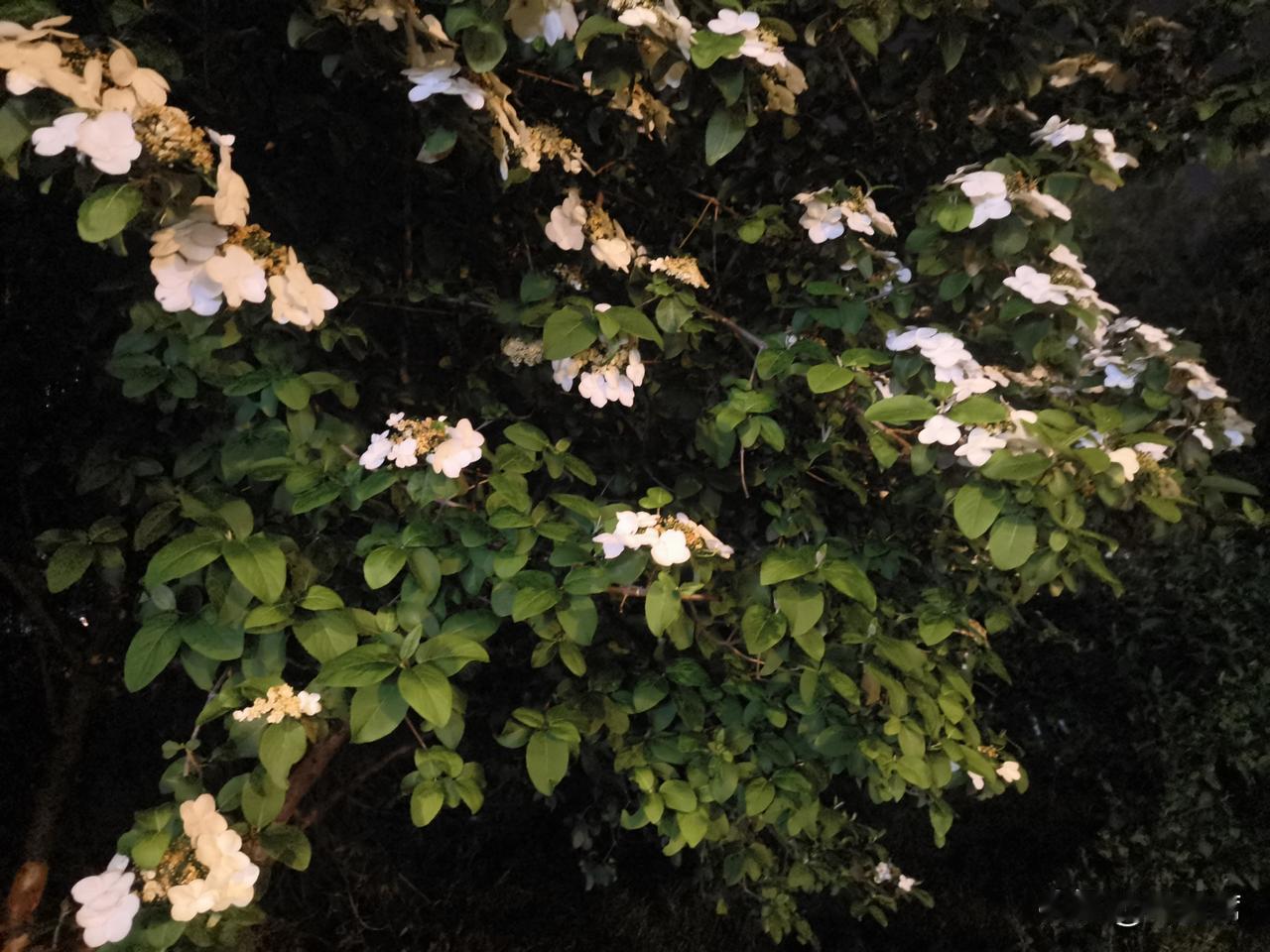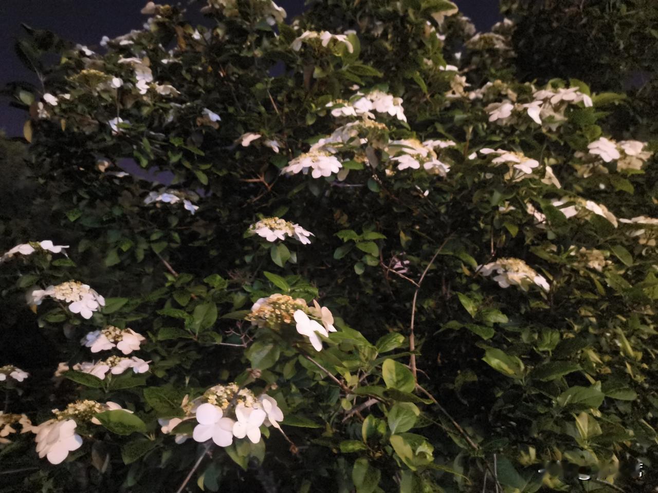 记录我的2026琼花洁白如雪,花瓣层层叠叠,在昏黄的夜灯映照下,像是被镀上了一层