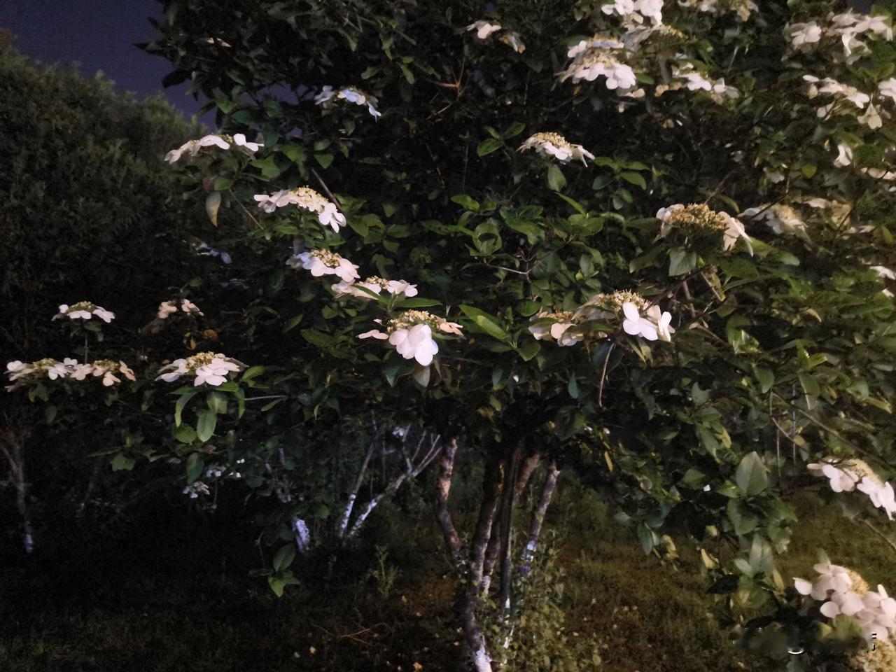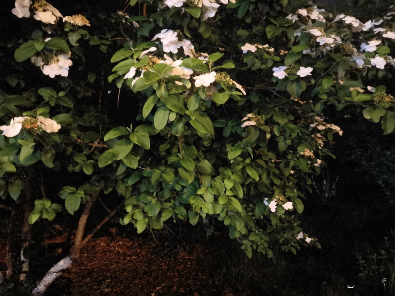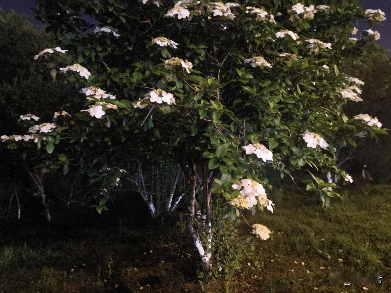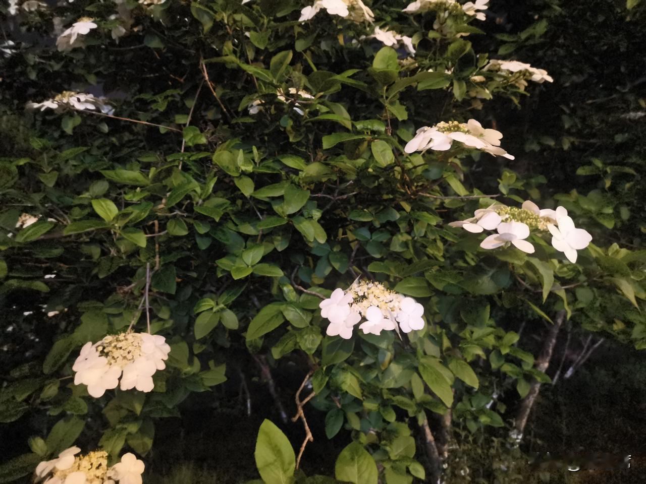 记录我的2026琼花洁白如雪,花瓣层层叠叠,在昏黄的夜灯映照下,像是被镀上了一层