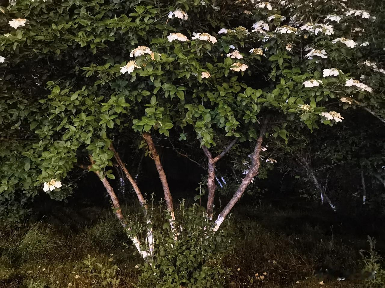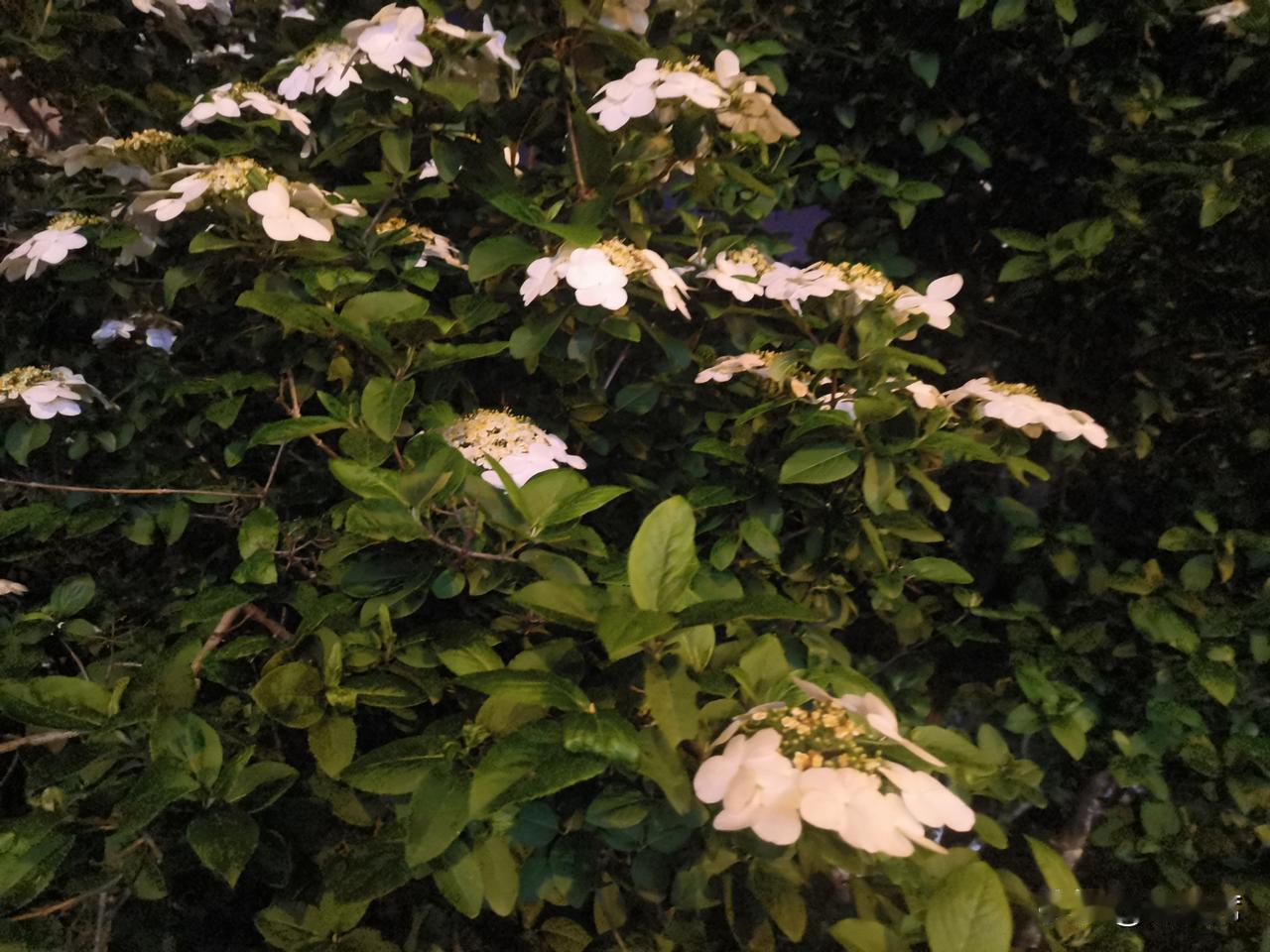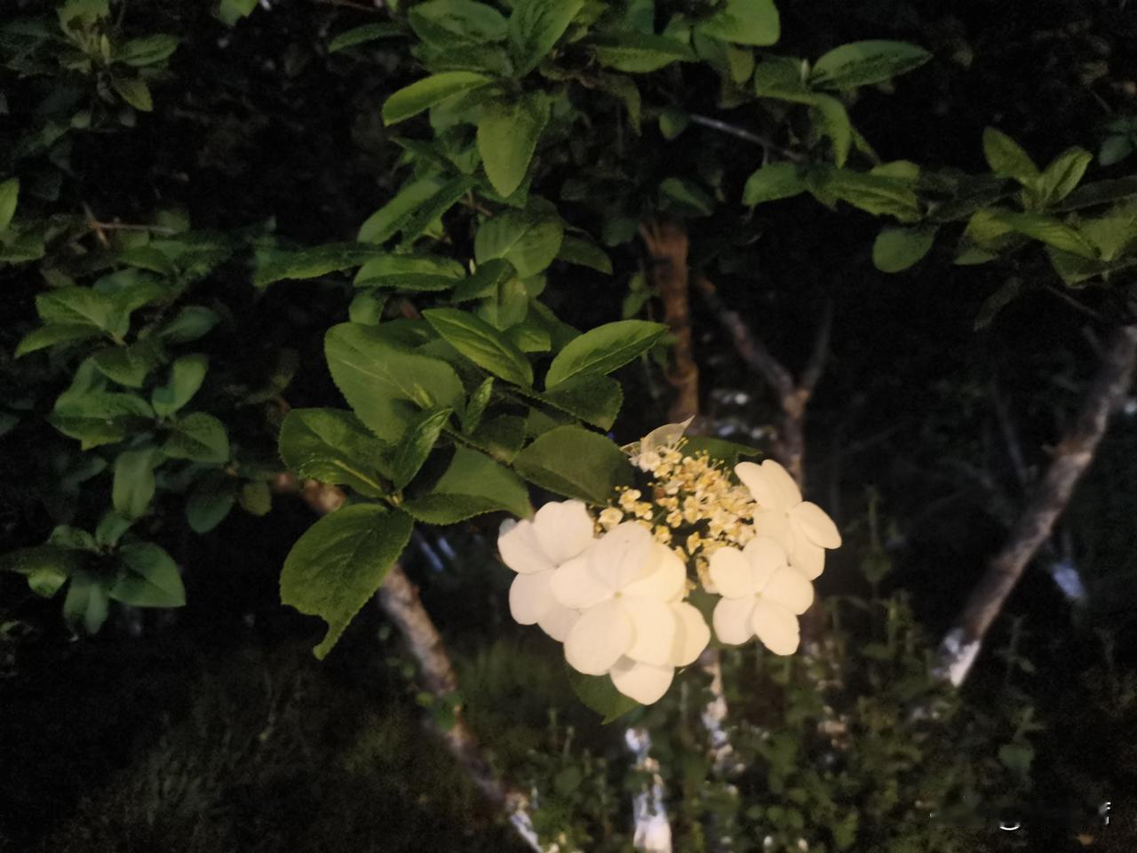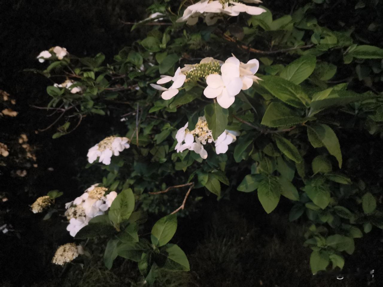 记录我的2026琼花洁白如雪,花瓣层层叠叠,在昏黄的夜灯映照下,像是被镀上了一层