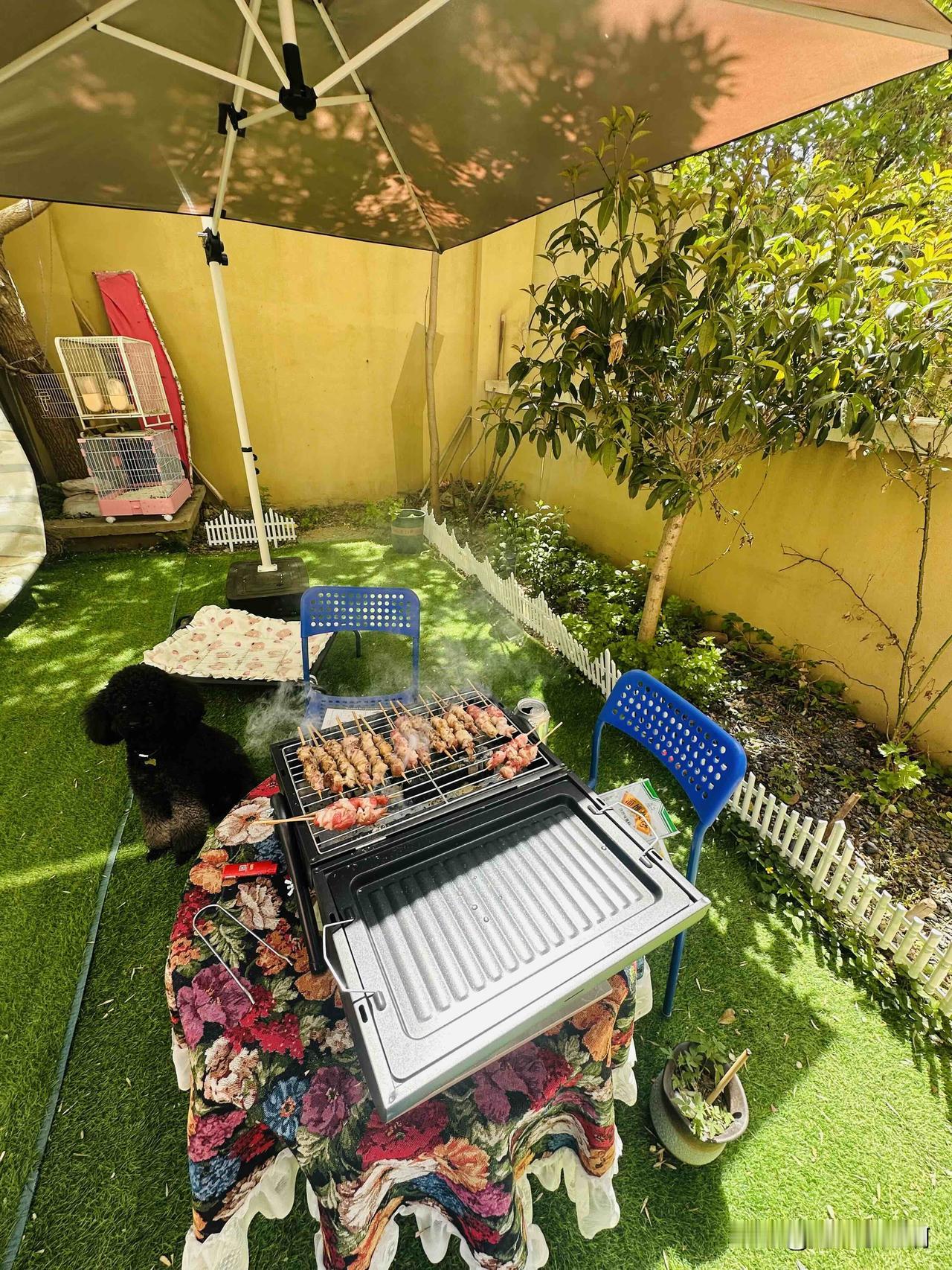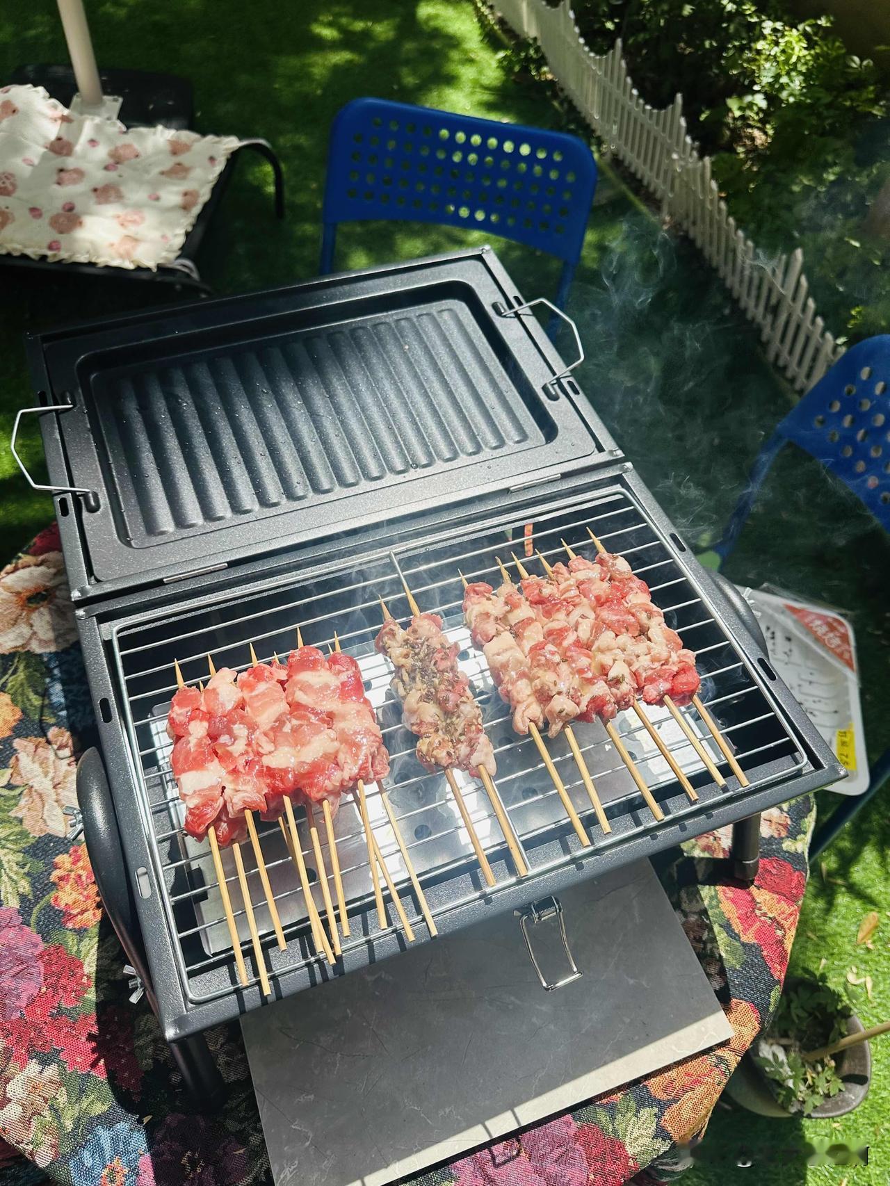 烤肉🥩 闲着没事阳光挺好,我前几天不是买了个小烤炉吗,下楼烤肉去,开开锅。 羊