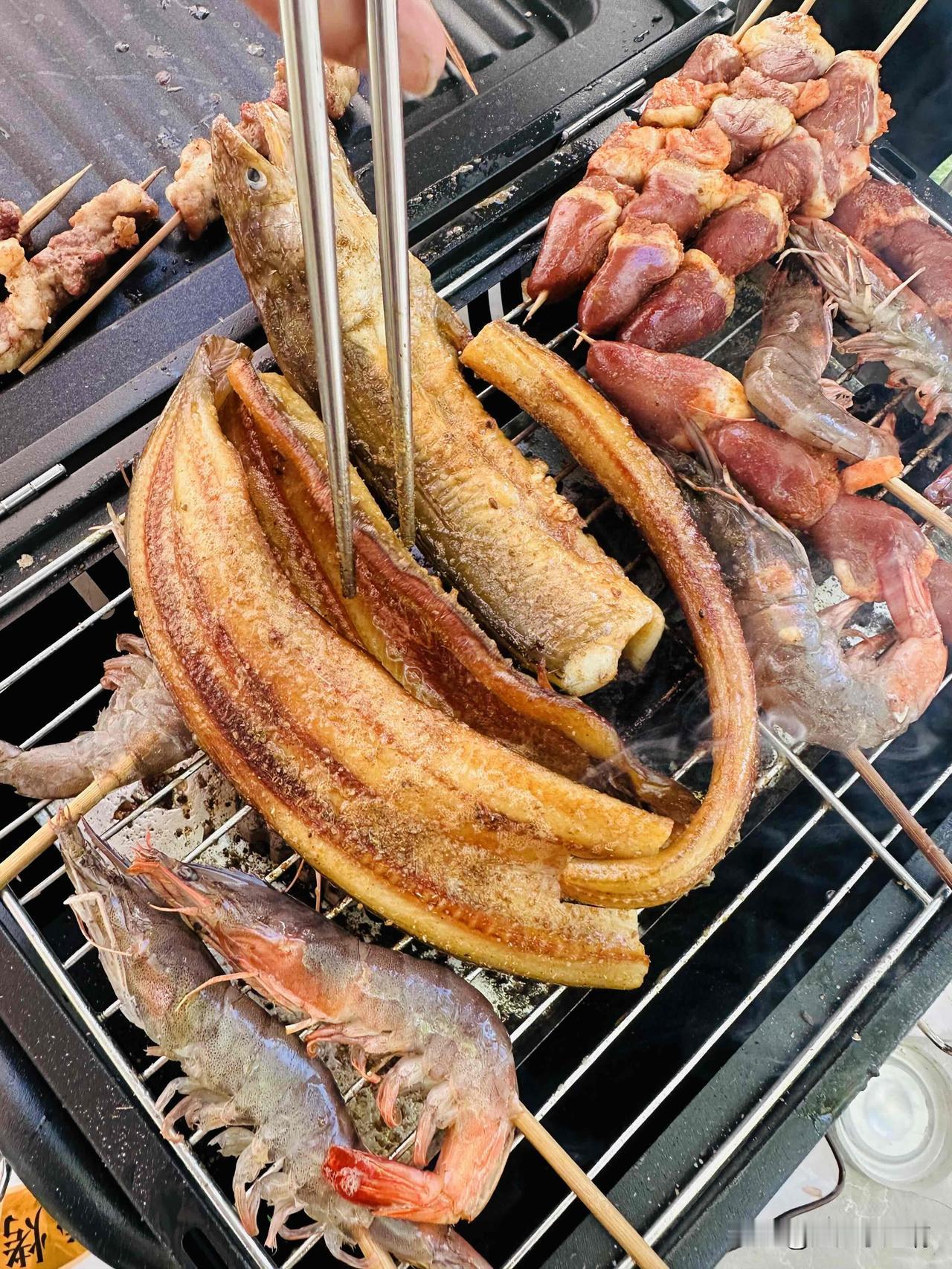 羊肉,猪五花,鸡心,里脊肉,又从冰柜里掏出来两条甜晒鳗鱼,几只虾。