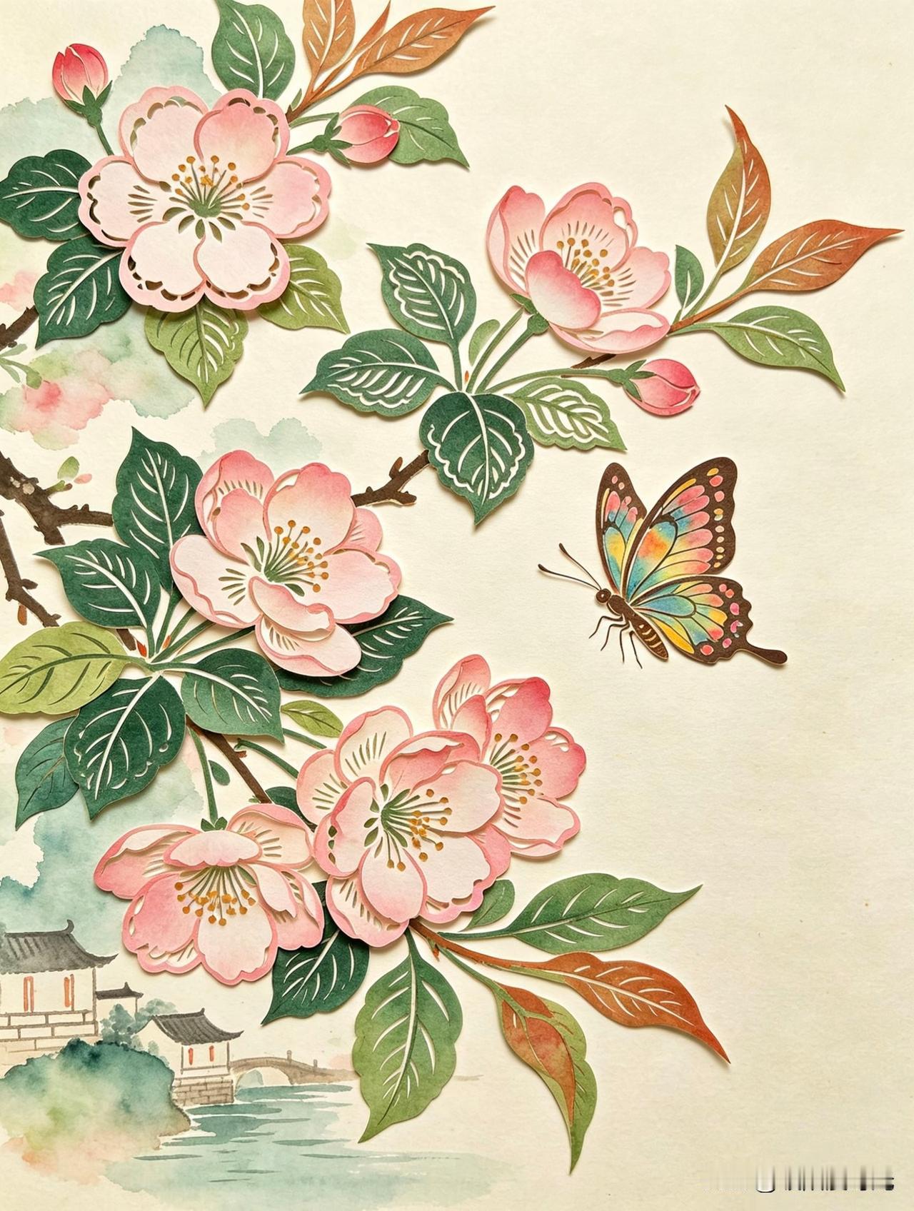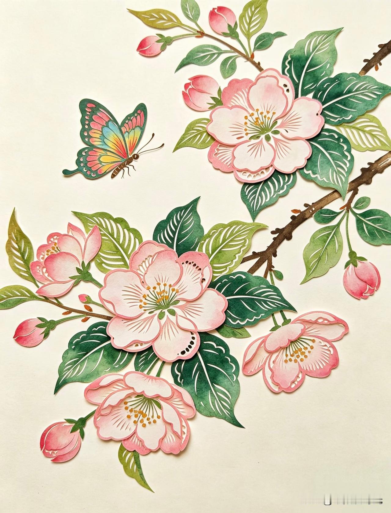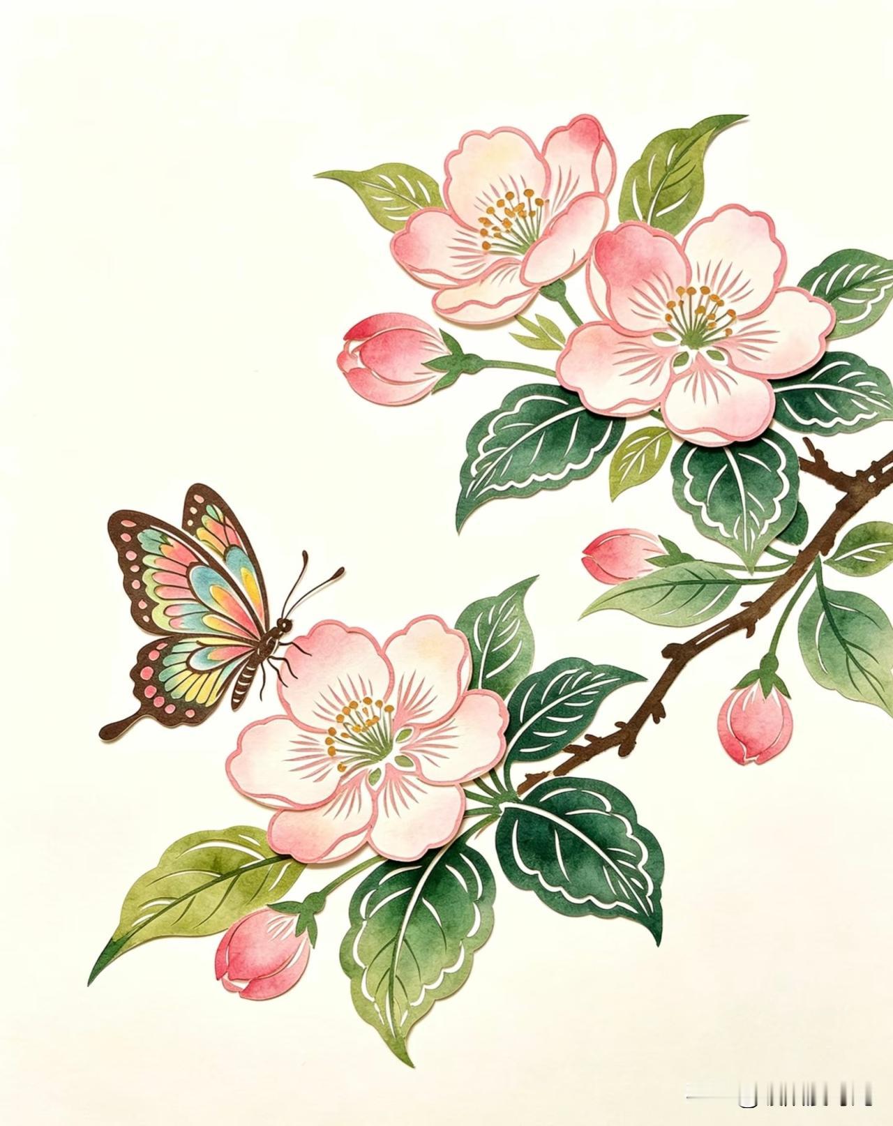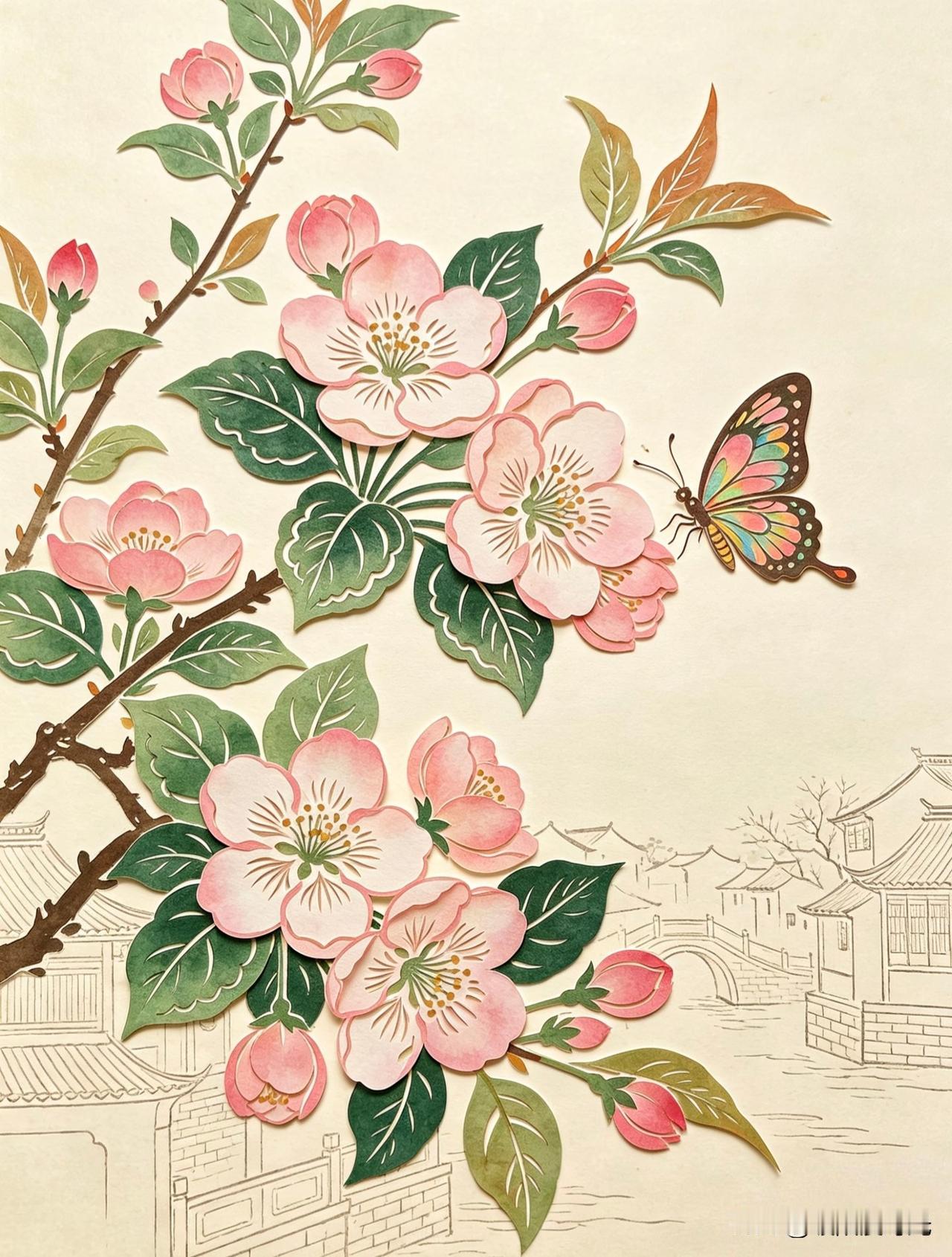 西府海棠俏,剪纸拼贴,春意枝头闹。