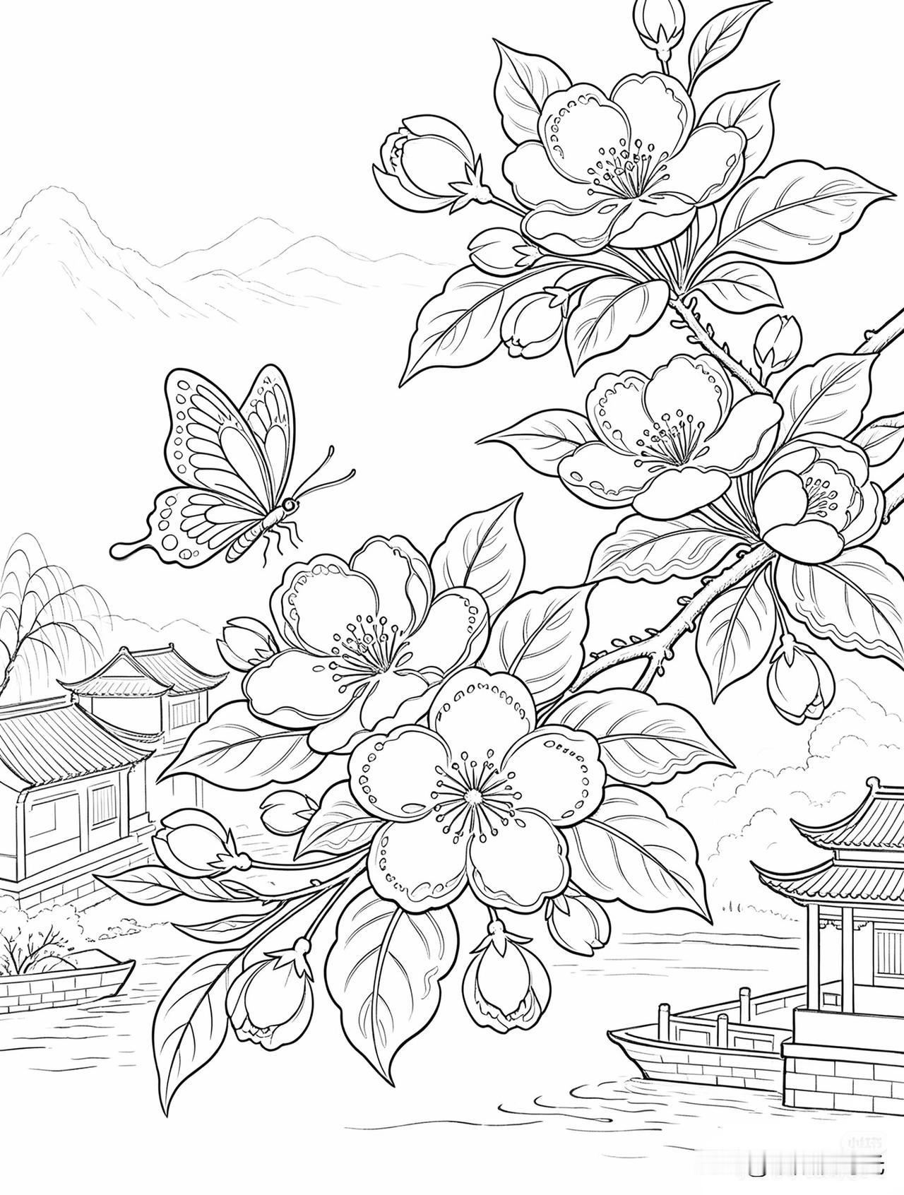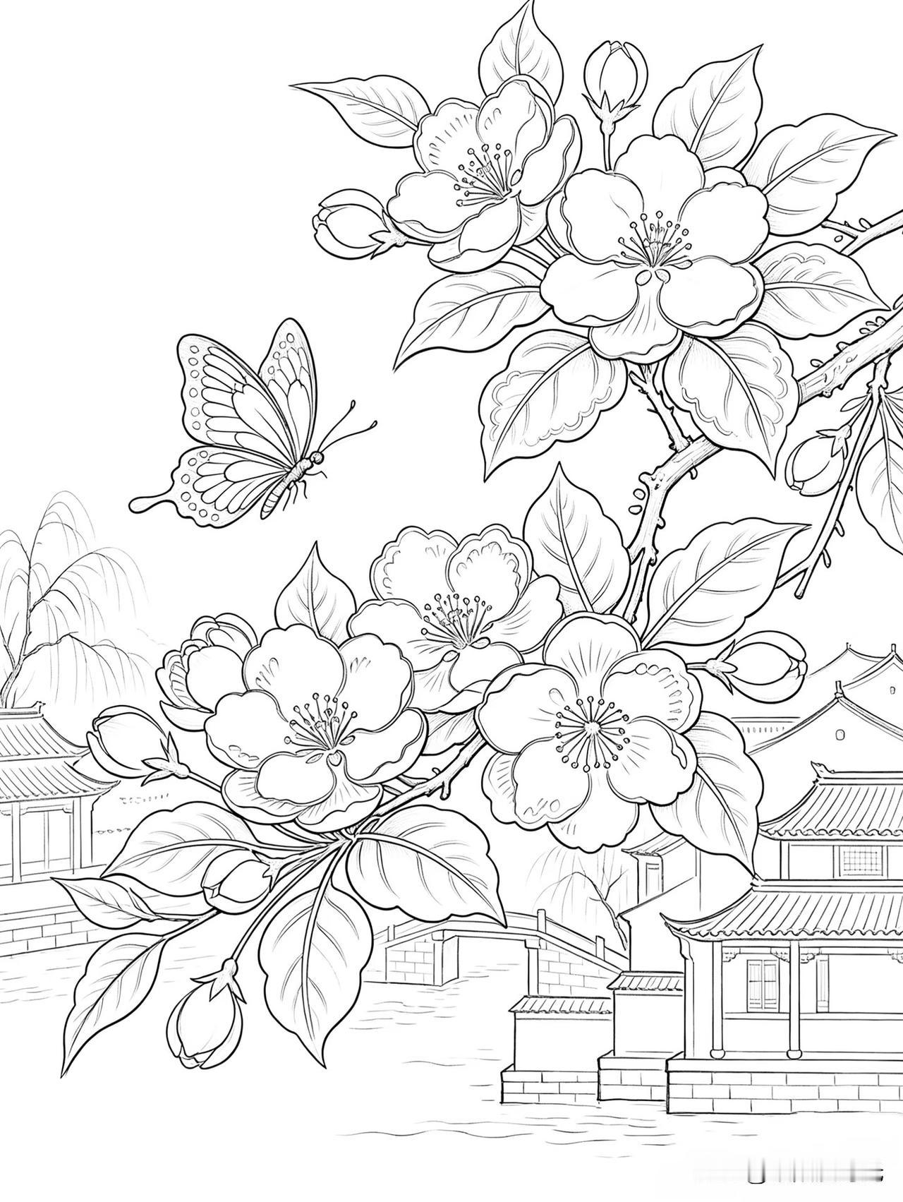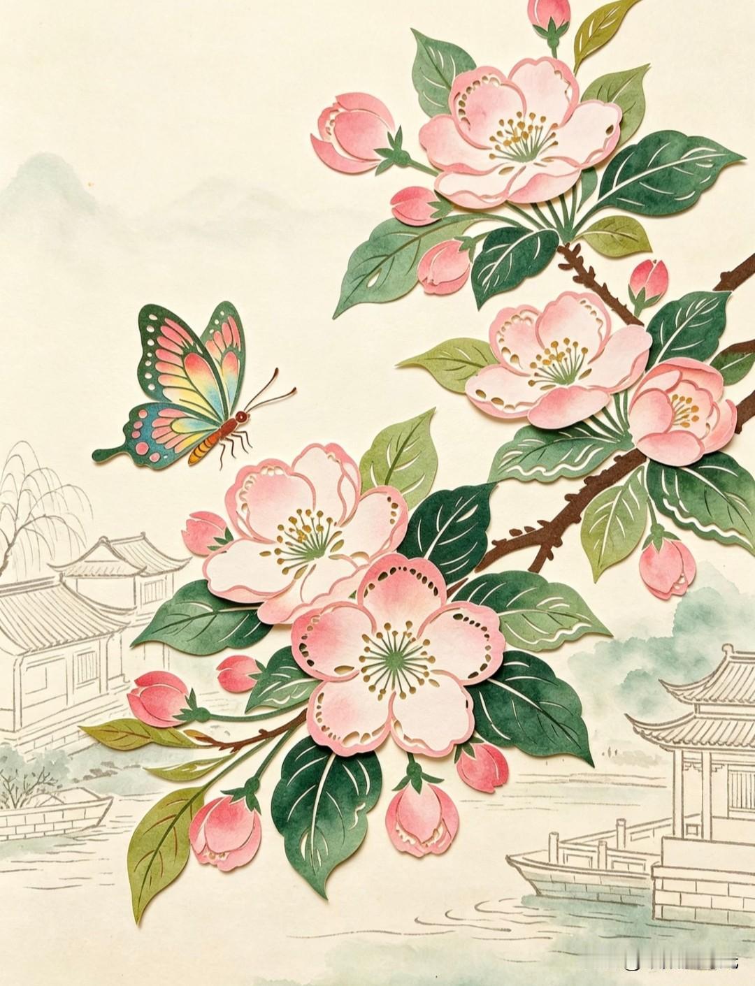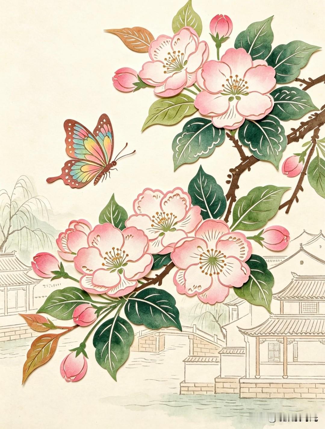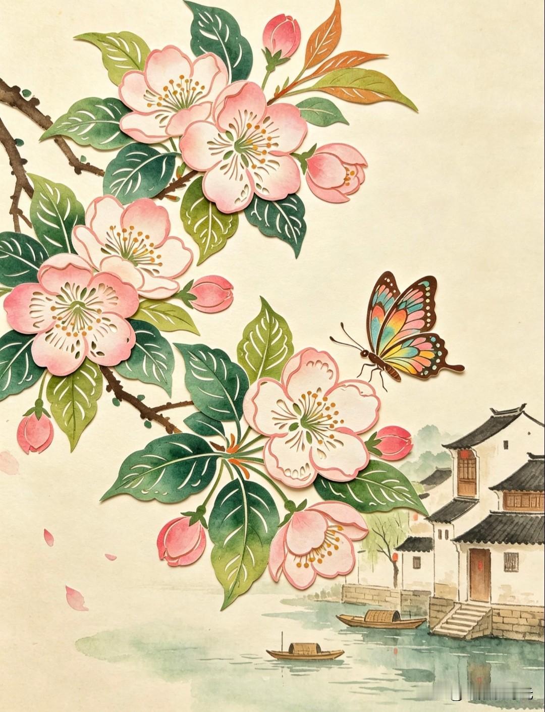 西府海棠俏,剪纸拼贴,春意枝头闹。