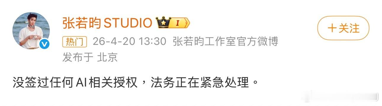 张若昀工作室 没签过AI授权张若昀工作室辟谣,强调没有签过任何AI授权。