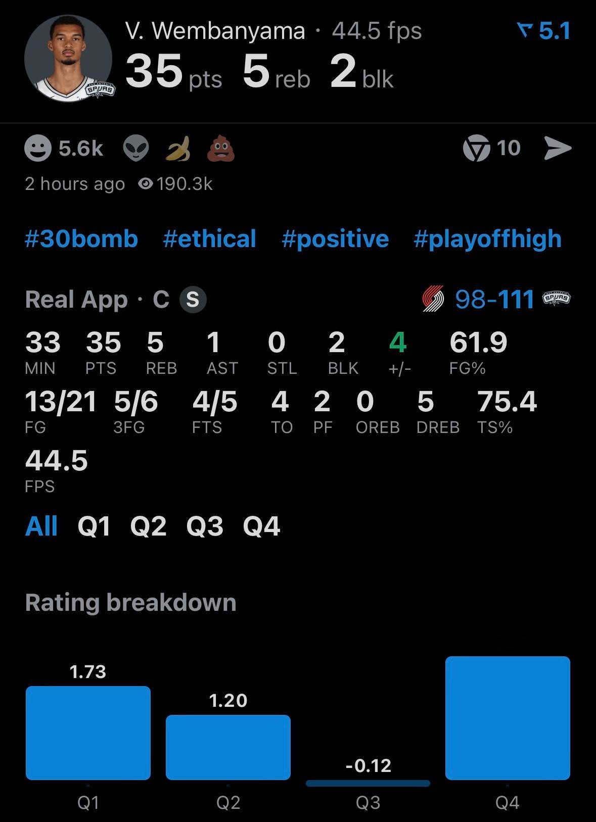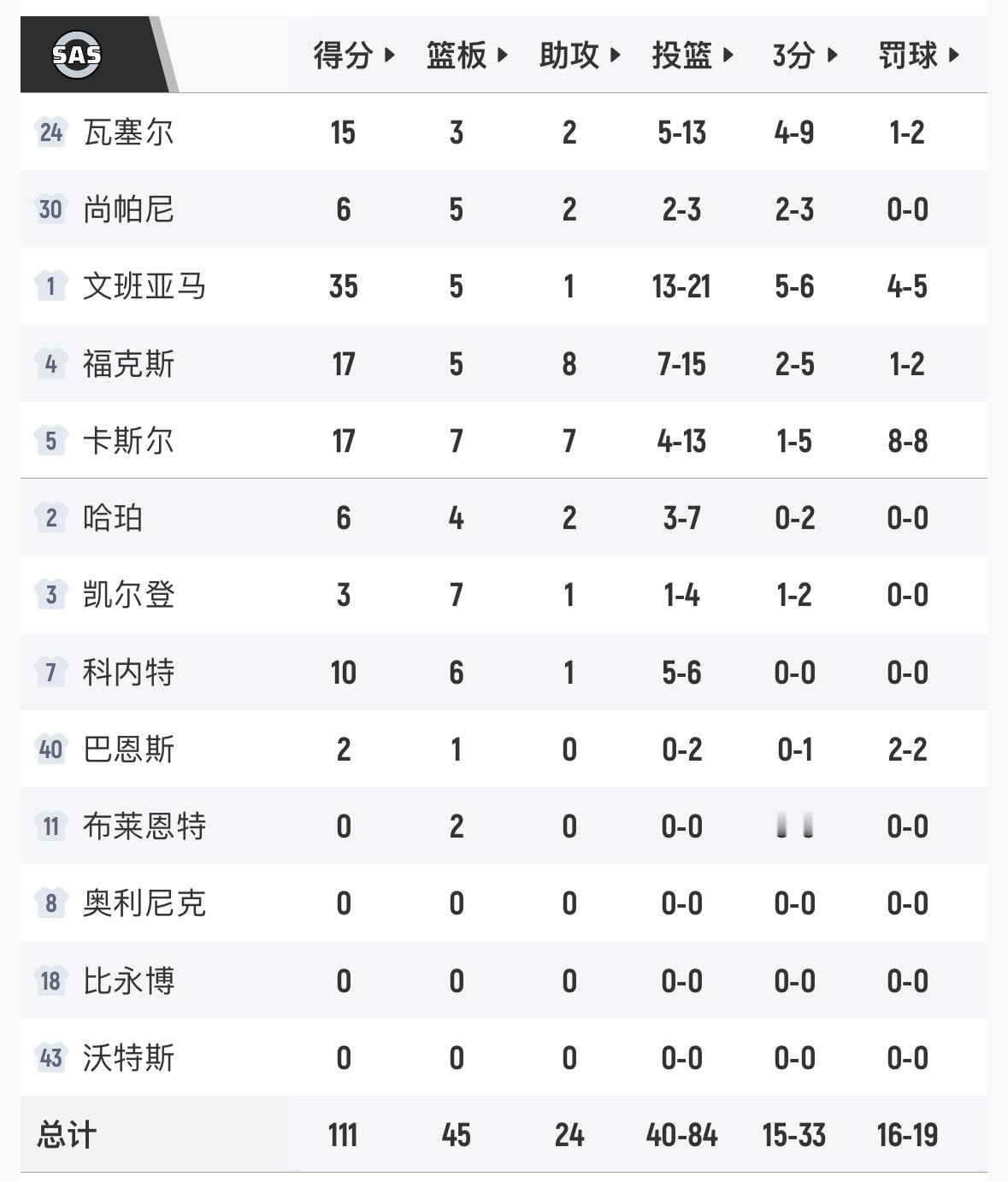 马刺主场111-98开拓者,系列赛1-0。 文班35分5板2盖帽,阿迪30分10