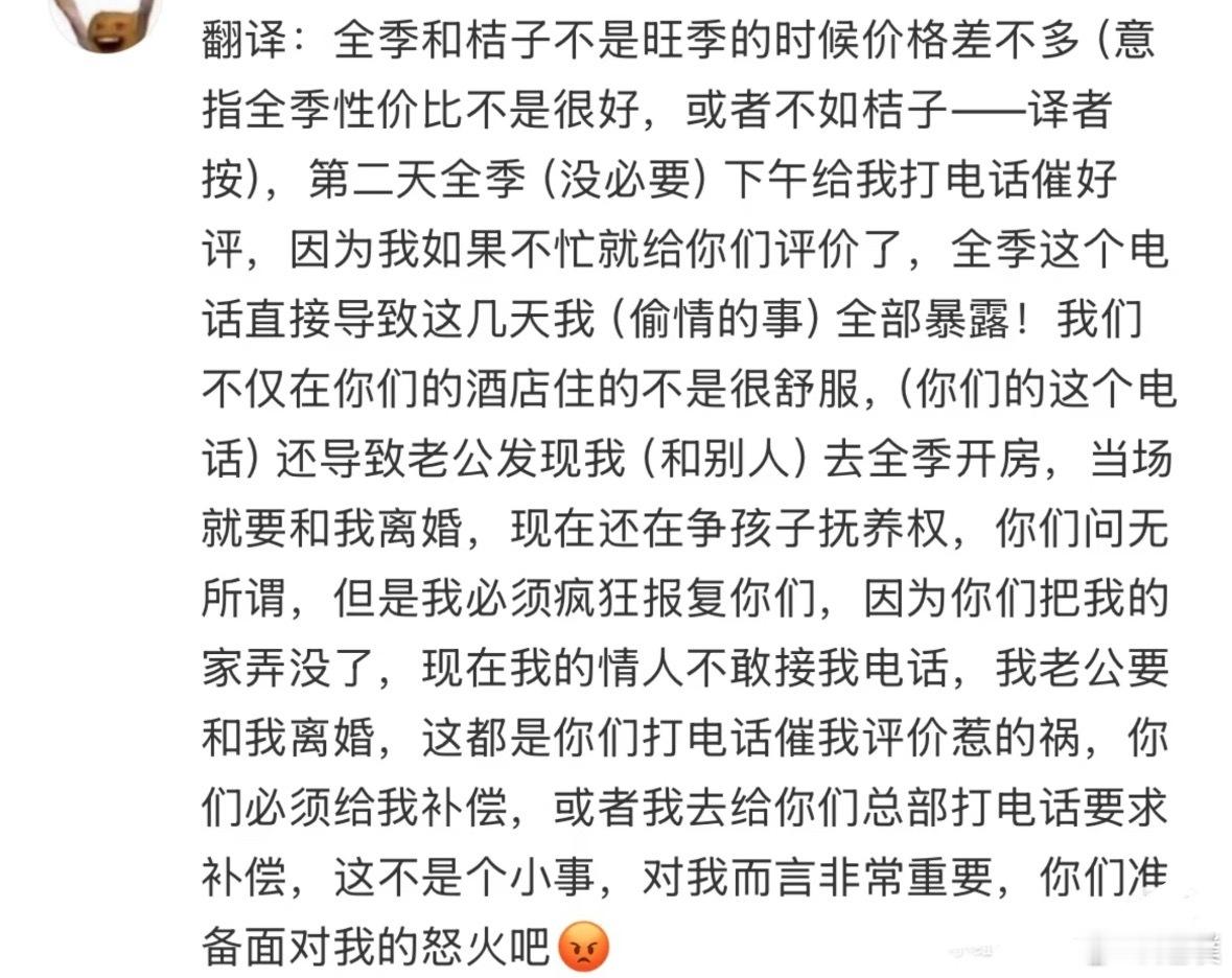 简单来说,女方出轨住的都是华住会,华住会退房必打电话要好评,这次打到人家老公知道了开房,还查到全在华住会旗下酒店开房,要离婚。 孩子归华住会抚养