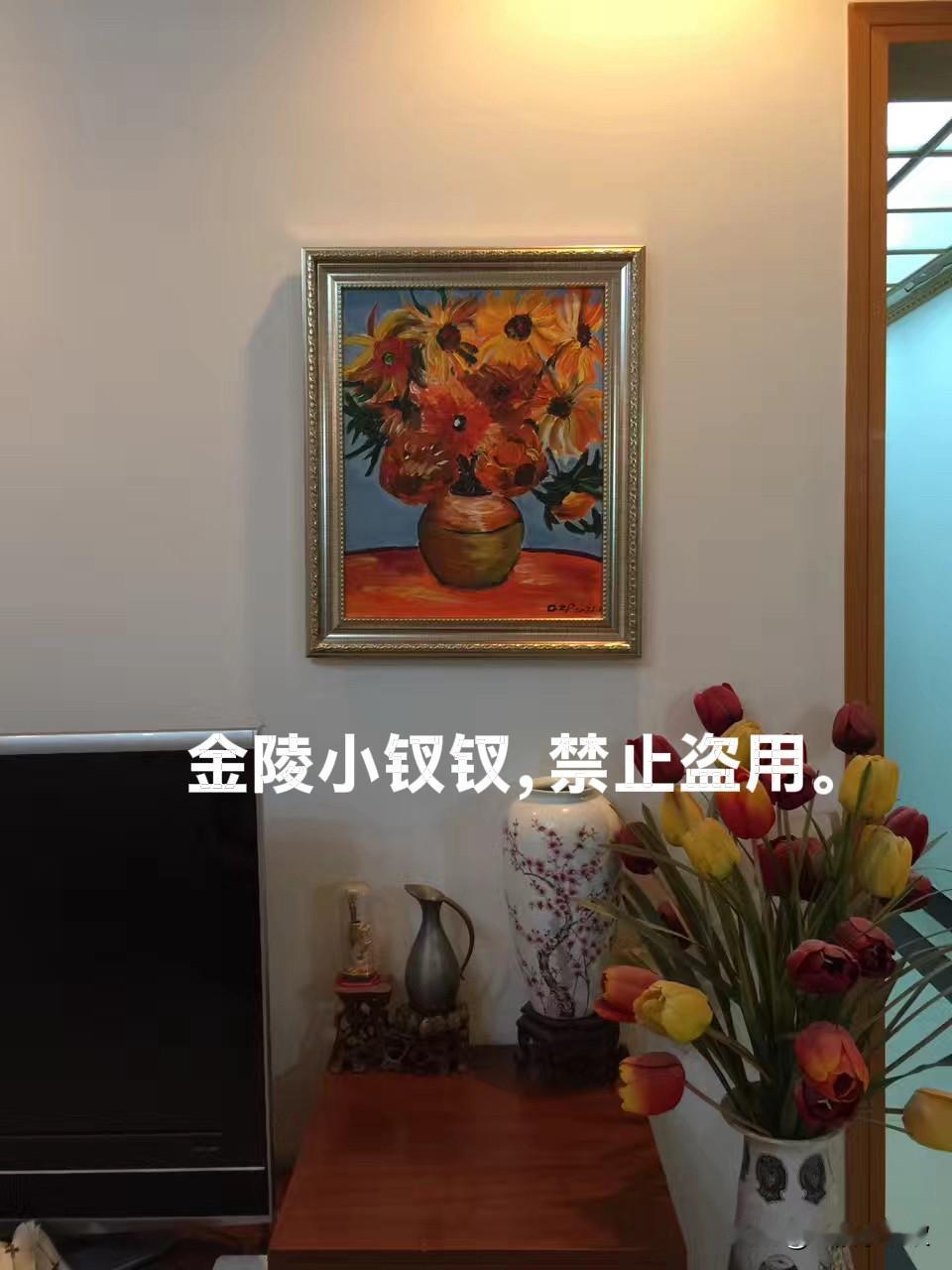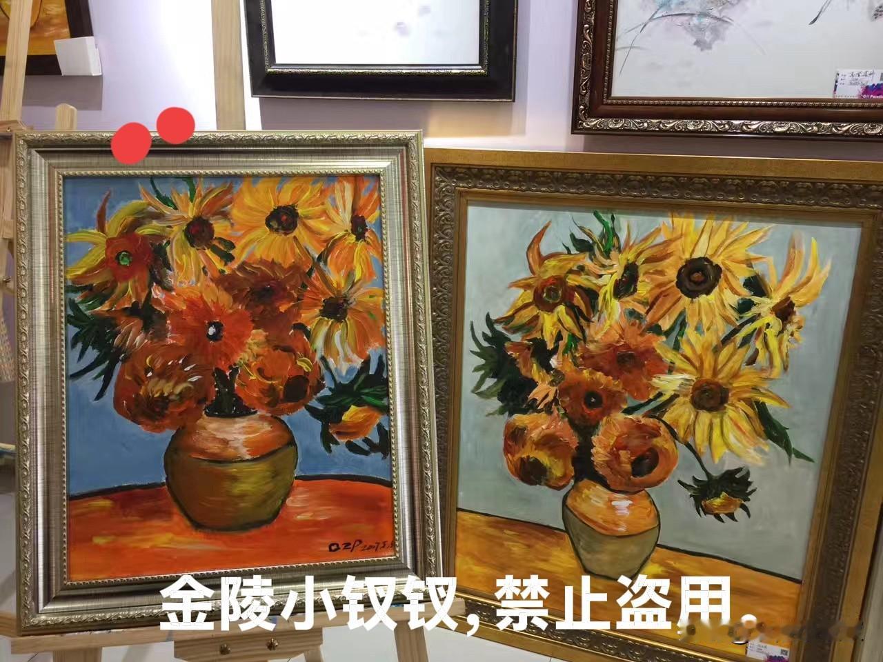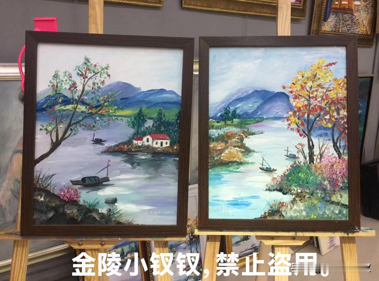 我这小气鬼一直没有置办装备,因为我不确定我是否能学到皮毛,虽然我曾无师自通的画过三幅油画(图4.5),图六的左侧那幅就是我第一次看到右侧那幅,拿起笔直接上手画的,最后放到一起拍照留念的。