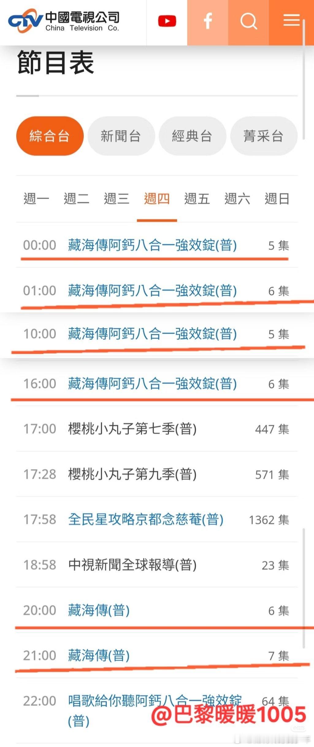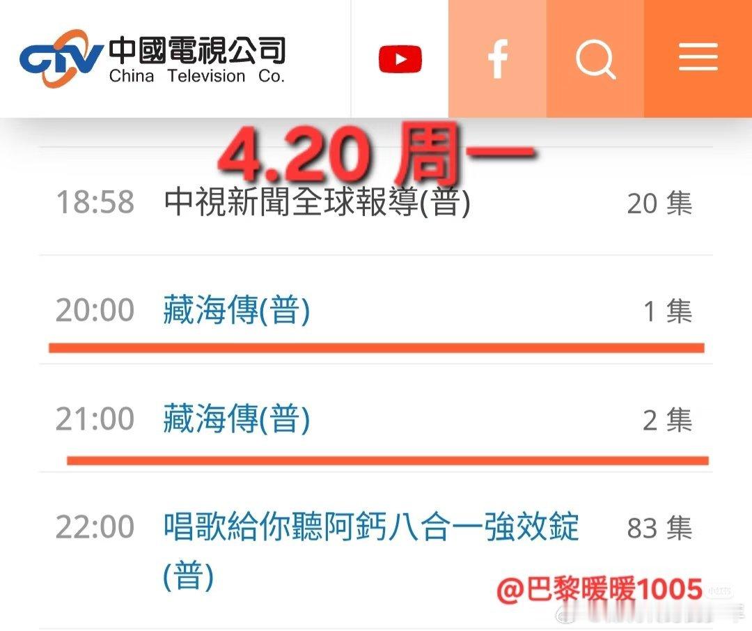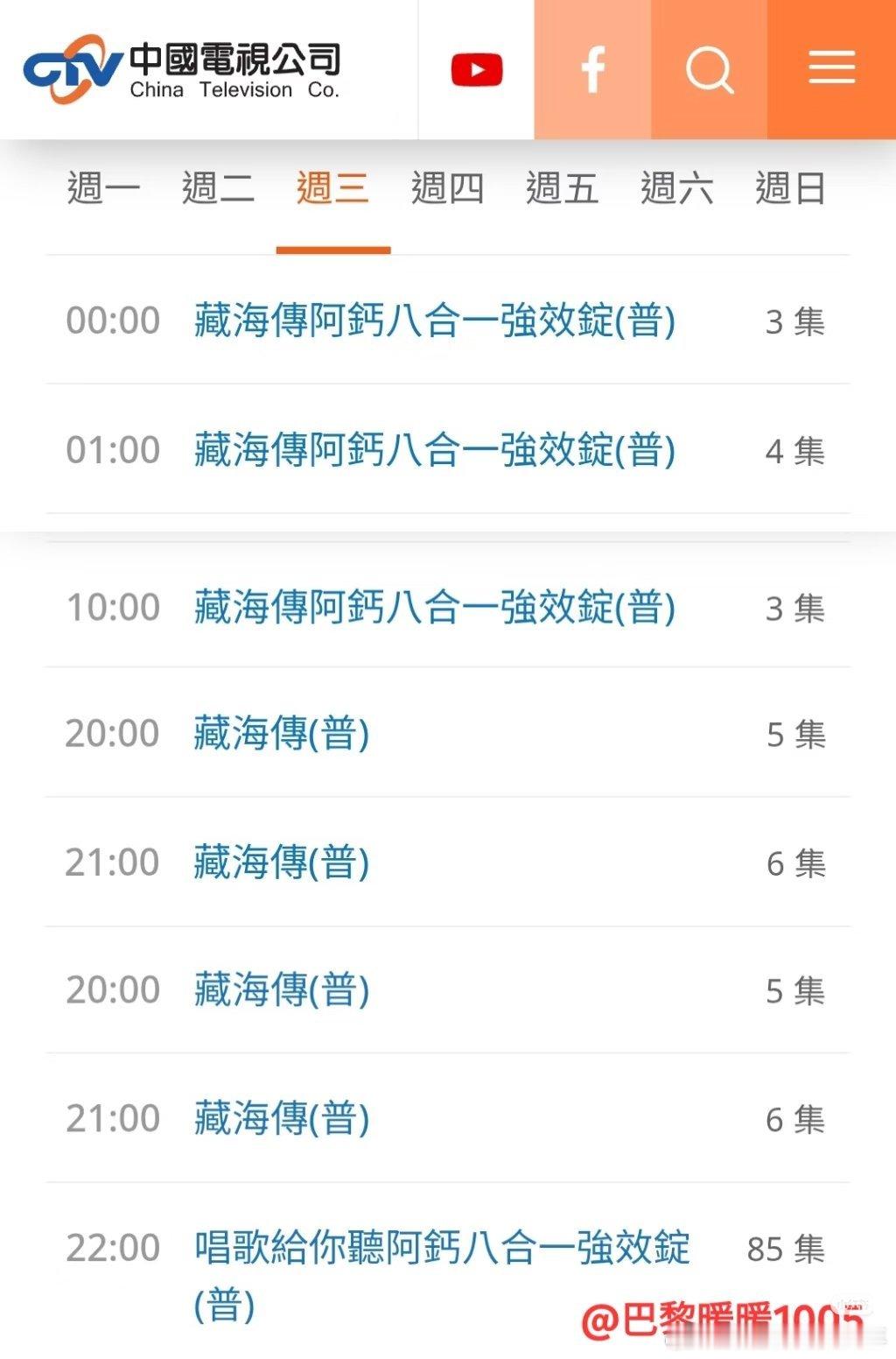 肖战藏海传重新定义何为霸屏!台湾中视全天都有《藏海传》❗下周节目表满屏的藏海传!黄金档、夜猫族、白天宅家党,每个时段统统安排到位,观众从周一晚8点开始一直到周六凌晨,都可以看《藏海传 》!真正做到为每一位观众着想👍而且已经有独家冠名赞助商赞助多时段重播,《藏海传》长尾效应和商业价值太牛笔了!