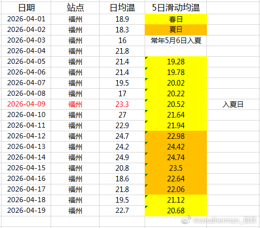 【换季】近期因为南方气温偏高,入夏进程快于常年。湖南南部、江西中南部、福建多地本来应该在谷雨节气到来后才入夏,但今年在谷雨节气前,已经完成春夏转换,夏季北界接近谷雨结束时的状态。比如福州就是4月9日提前入夏,比常年5月6日提前了27天。因为提前不到30天,即便近期返春,也不用二次判定。