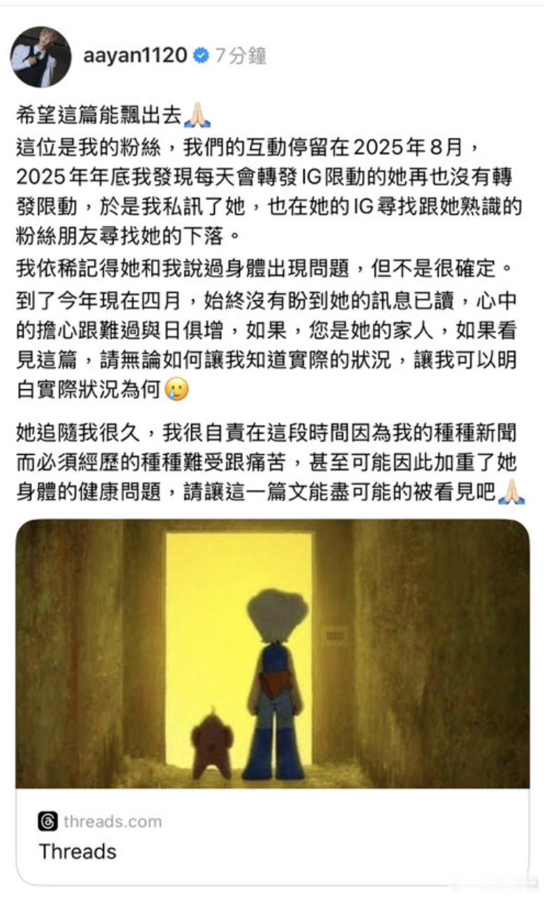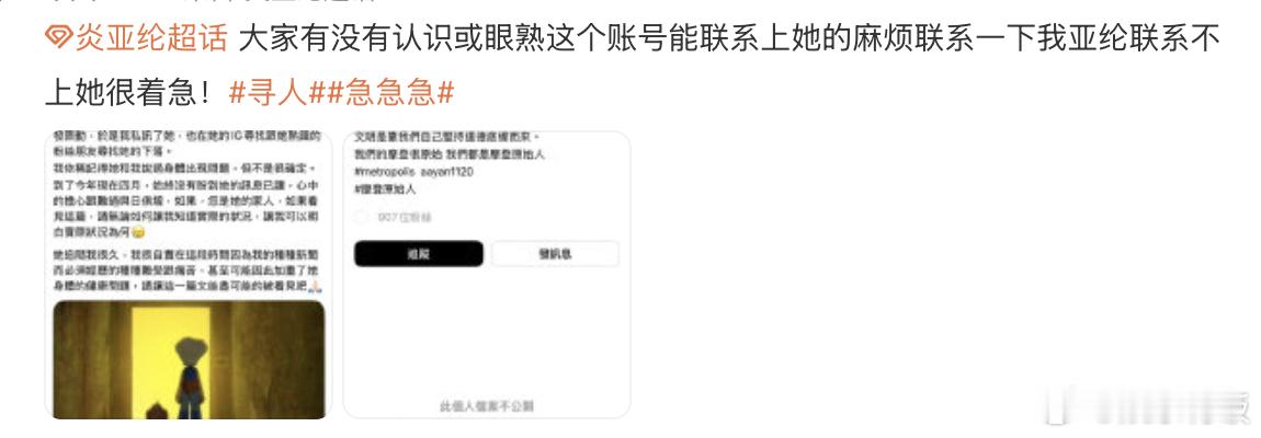 炎亚纶发帖寻找生病失联粉丝炎亚纶因负面新闻太多感到自责 炎亚纶发长文寻找自去年 8 月后失联的老粉丝,对方之前和他提过身体出现问题,断联后他一直很担心,更坦言因为自己的诸多负面新闻感到格外自责,怕这些风波加重了粉丝的健康状况,恳请认识她的人帮忙传递消息,粉丝超话也在同步扩散寻人,盼能早日收到平安回应🙏