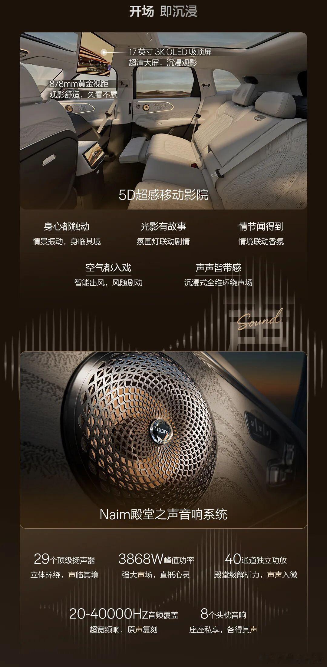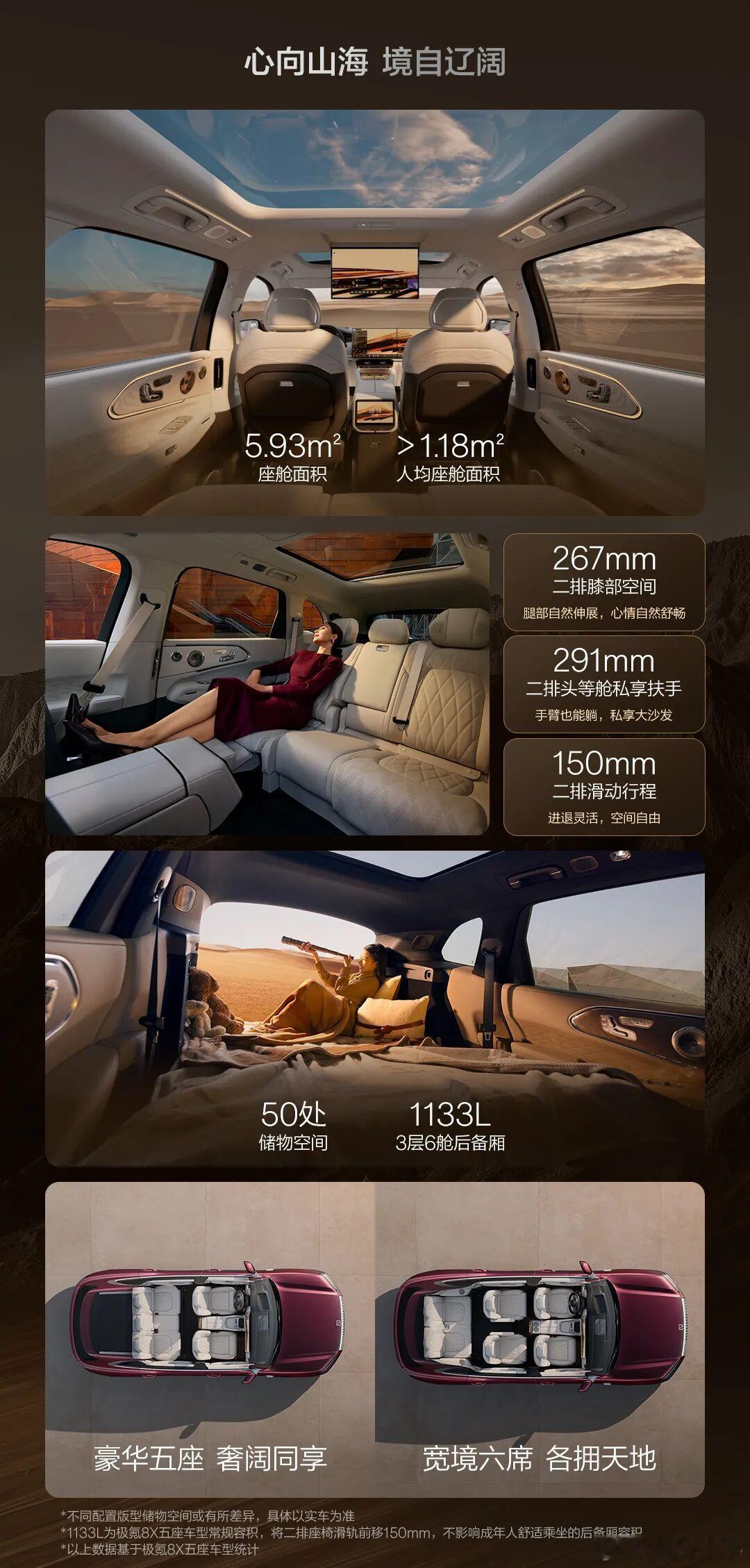 简单总结一下极氪8X。作为极氪新推出的高性能旗舰SUV,极氪8X搭载浩瀚-S超级电混架构以及SEP浩瀚超级电混动力。全栈900V高压平台、兆瓦级三电及70度6C混动电池,满电馈电,零百加速仅相差0.2S,带来更强大的混动构型。CLTC纯电续航里程最长410km,综合续航里程最长1416km。全球首个4S级AI数字底盘——浩瀚AI数字底盘。实现AI预判+顶级硬件全域协同。空间大,座舱面积达5.93m²,全车多达50处储物空间,3层6舱后备厢共1133L。配备伊姆斯躺椅,5D超感移动影院,Naim殿堂之声音响系统,二排配有隐私遮阳帘。尺寸方面,曜影版能达到车长5108mm,轴距3069mm,宽2026mm。不仅尺寸到位,还是一个实打实的智慧出行伙伴。新公路之王极氪8X正式上市 极氪8X新能源汽车极氪大v聊车