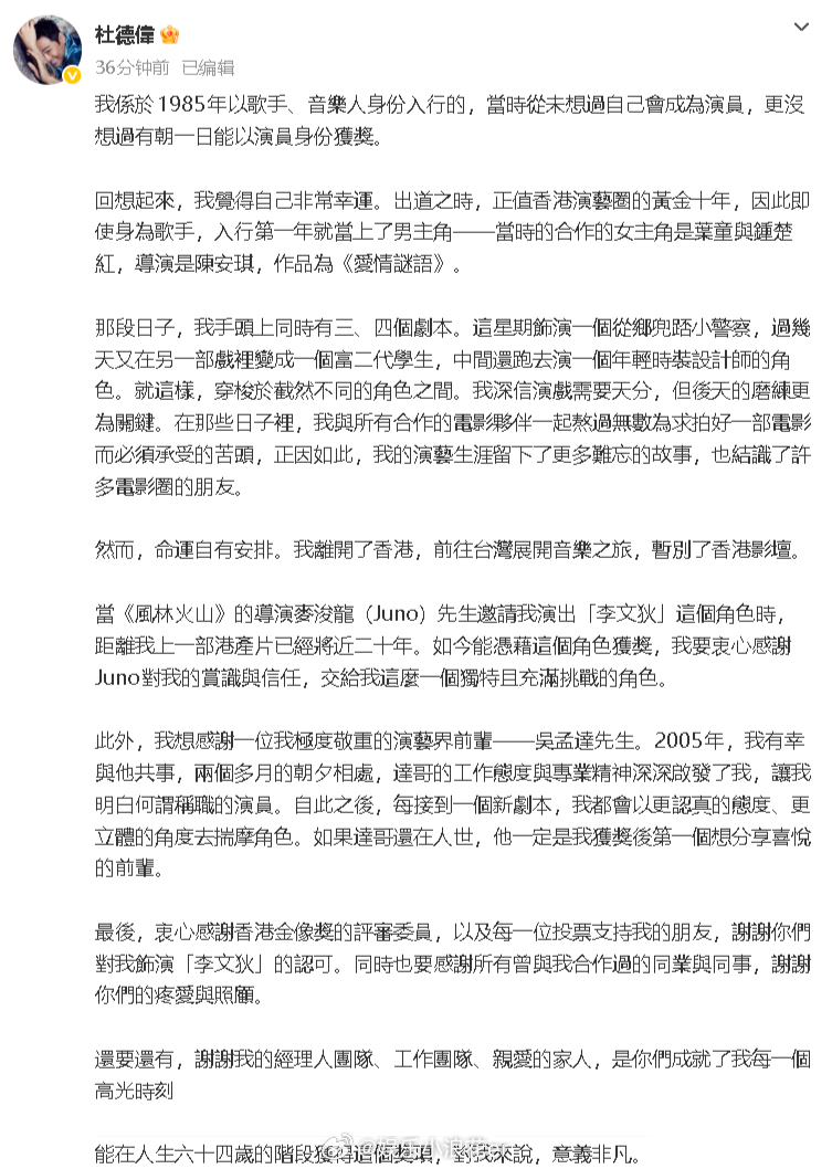 杜德伟回应获金像奖最佳男配 杜德伟回应获金像奖最佳男配:我在 1985 年以歌手、音乐人的身份出道,当时从来没想过自己会成为演员,更不曾料到,有一天竟然能凭借演员的身份获奖:“能在人生六十四岁的阶段获得这个奖项,对我来说,意义非凡。”恭喜!