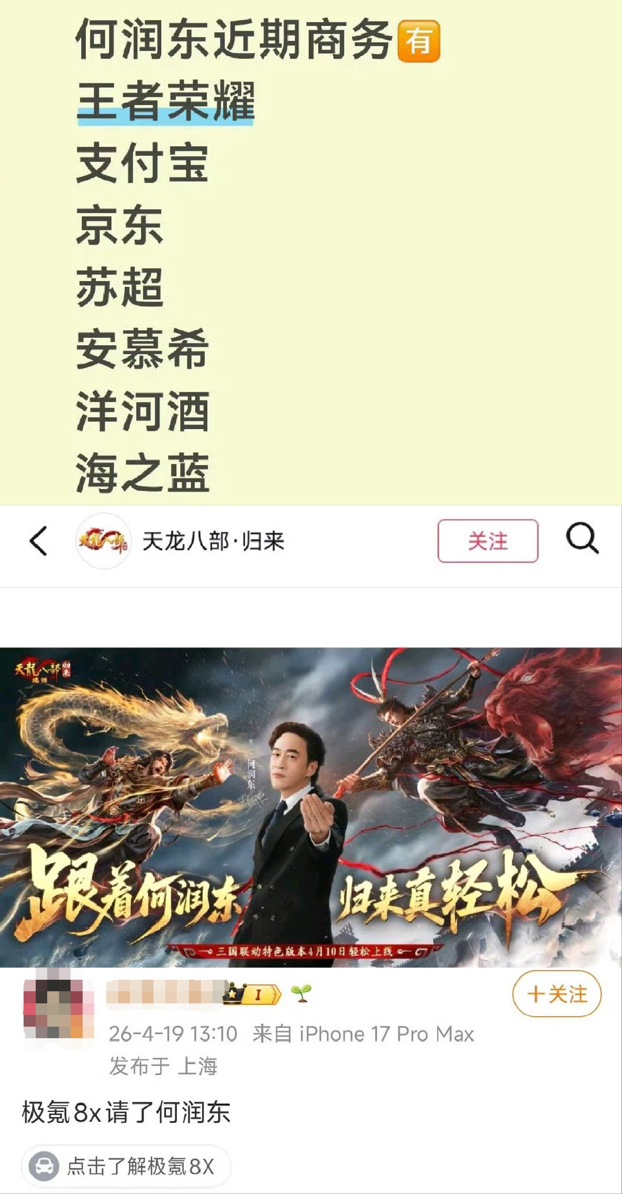 网传消息称,何润东成为极氪8X代言人。若何润东再次拿下车代,这将是他“翻红”后1