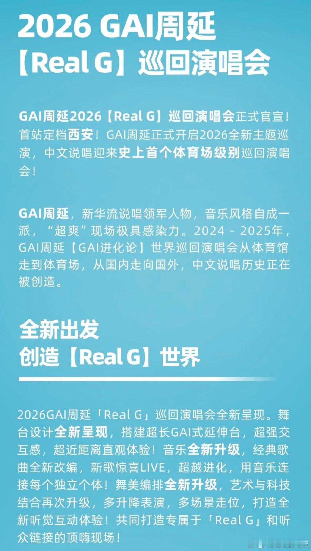 GAI国内首个说唱体育场巡演GAI体育场巡演西安站官宣 GAI周延REAL G演唱会首站5.30西安奥体中心体育场!中文说唱历史首个体育场级别巡演,中文说唱体育场元年,中文说唱天花板!