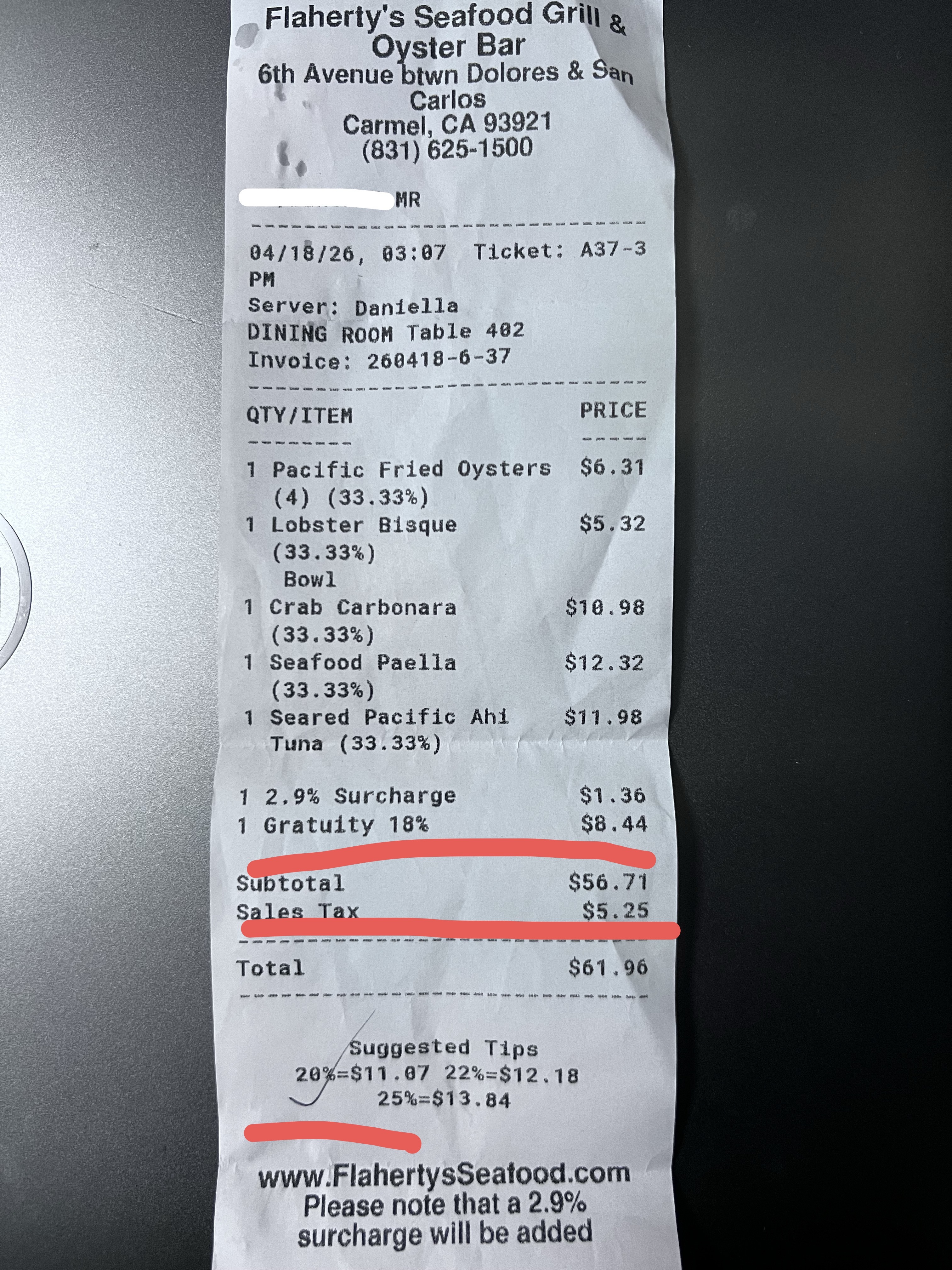 “来了快一个月基本都是吃中餐,昨天中午和没有吃过本地西餐的同事吃了一顿,人均73美元,小费、税一大笔。