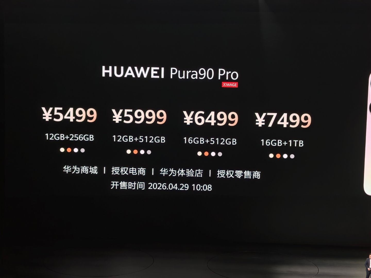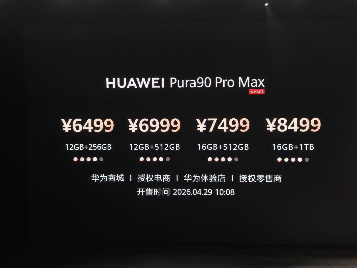 HUAWEI Pura90 Pro Max(2026.04.29 10:08 开售)12GB+256GB:¥649912GB+512GB:¥699916GB+512GB:¥749916GB+1TB:¥8499