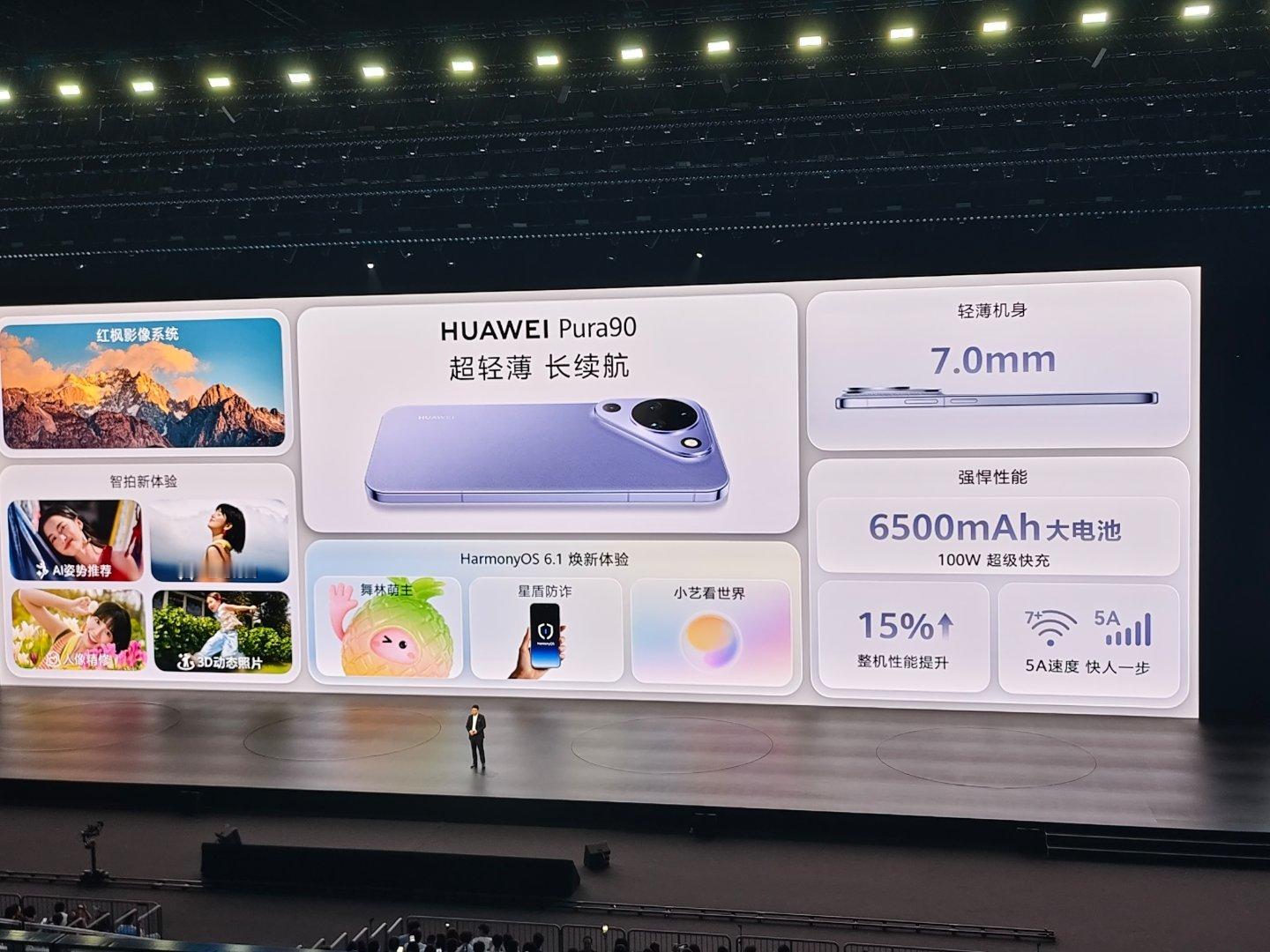 不止Pro 和 Pro Max ,这次华为Pura90 标准版也很强啊!搭载6500mAh大电池,整机只有7mm的厚度,后置50MP超聚光主摄,50MP超聚光潜望长焦,12.5MP超广角,而且前后都有红枫原色摄像头。华为发布会 华为Pura系列新品发布